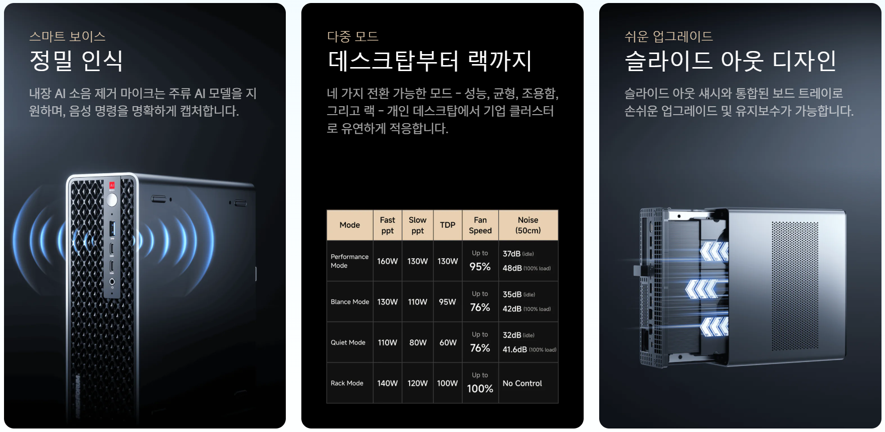 MS-S1 MAX 미니PC는 16코어/32스레드 기반의 AMD 라이젠 최상급 모바일 프로세서 Ryzen™ AI MAX+ 395 CPU를 탑재했으며, 내장그래픽 또한 역대 최상급인 라데온 8060s를 내장했다. 여기에 128GB 메모리는 LDDR5x로 8000MHz 고성능 클럭을 갖췄고, 4가지 성능 모드 지원으로 워크스테이션분야부터 게임분야까지 모든 고객을 만족할 수 있게 지원하고 있다. 또한, AI 소음 제거 마이크 내장으로 음성 인식 서비스를 지원하며, 슬라이드 아웃 디자인으로 본체 분리가 쉽도록 해 업그레이드 편의성을 갖추었고, 미니PC 최초로 80Gbps 전송속도의 USB 4 V2 포트를 2개 갖추었다.