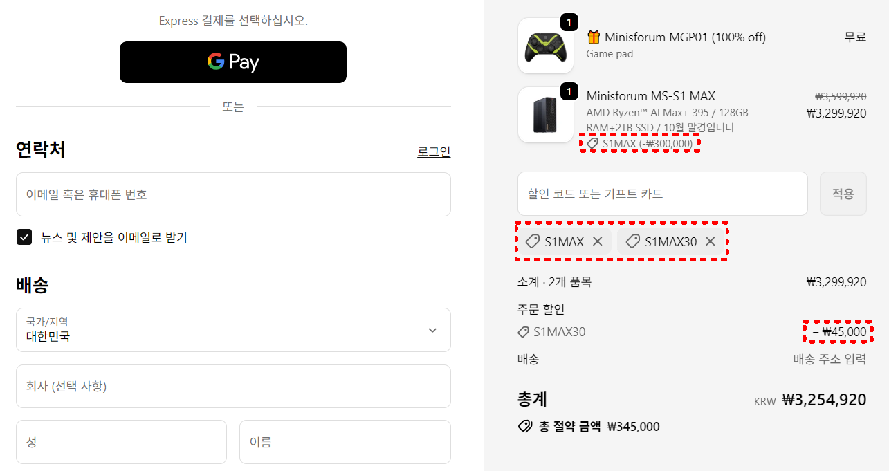이번 MS-S1 MAX 미니PC 사전예약의 구매 옵션은 CPU를 포함 메모리 128GB, 저장장치 2TB SSD를 포함하고 있으며, 할인코드 적용은 회원가입 후 장바구니에 상품을 담고, 결제진행에서 30만원 할인코드 'S1MAX'를 입력하고, 그 다음 다시한번 45,000원 할인의 'S1MAX30'을 입력하고 중복으로 적용된다. 또한, 이번 사전예약 구매시 자사의 MGP01 게임패드를 사은품으로 증정해주고 있다. 참고로, 미니스포럼 코리아에서 제품 구매시 1년의 보증기간을 받을 수 있으며, 한국 전지역 무료배송이다.