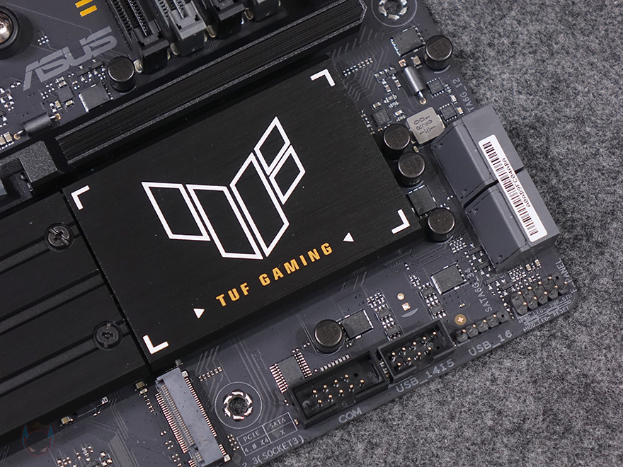 CPU 소켓 주변에 위치한 전원부에는 모두 방열판이 기본 장착되어 있는데, 방열판 디자인은 먼저 출시했던 모델과 동일하게 백패널 I/O 방향 방열판에 TUF GAMING 로고를 새겨놨죠. 방열판을 분리하면 전원부의 초크와 모스펫부분에 발열 해결을 위해 써멀패드가 기본 부착된 걸 확인할 수 있고, 전원부는 14+2+1 페이즈 구성으로 먼저 출시했던 모델과 동일합니다. 물론, 모스펫도 Alpha&Omega semiconductor사의 칩으로 개당 80A 전력공급을 지원하는 Dr.MOS이며, 전원부 컨트롤러 칩셋도 ASUS Digi+ VRM/EPU 칩 적용으로 디지털 전원부 구성이고, CPU 보조전원도 8핀 2개 구성으로 모두 동일합니다.