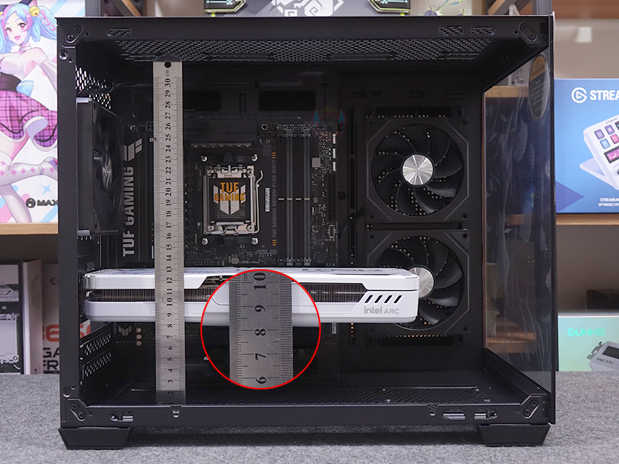 끝으로, 이번 ASUS TUF Gaming B850M-PLUS WIFI7 메인보드는 앞서 확인했듯이 그래픽카드가 장착되는 PCIe 슬롯이 PCI 1번 위치에 배치되었습니다. 이게 미들타워 PC케이스에서는 큰 의미가 없겠지만, 최근 M-ATX 메인보드에 맞춰서 미니타워 PC케이스를 선택하는 소비자들이 많아졌기때문에, 미니타워에서는 그래픽카드 쿨링효과에 꽤 영향을 줄 수 있습니다. 미니타워 PC케이스에 그래픽카드까지 장착해 보면, 약 80mm가 넘는 하단 여유공간이 생기죠. 일반적으로 PCIe 슬롯이 2번에 배치되는 메인보드에 그래픽카드를 장착했을 때보다 약 1cm 이상의 하단 공간을 확보하기 때문에 좀 더 그래픽카드 쿨링효과를 높일 수 있습니다.