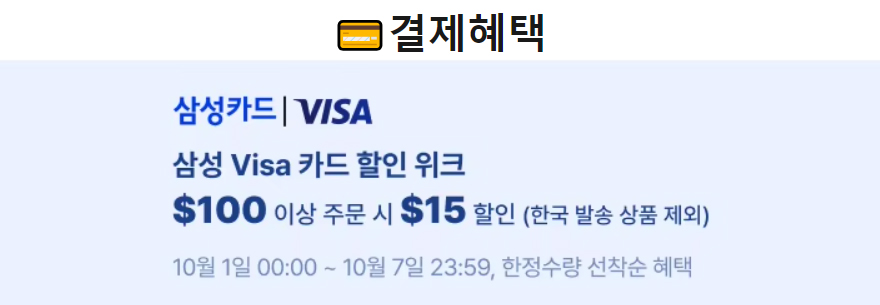 그래서, 이번 10월 한가위 대잔치 초이스데이 행사는 프로모션 행사와 마찬가지로 결제할인이 적용되는데, 삼성 비자카드로 100달러 이상 결제 시 15달러 할인을 받을 수 있다. 또한, 할인코드 역시 이번에 초이스데이와 프로모션 통합 행사이기 때문에 총 10개의 가격대별 할인코드가 제공된다. 19달러 구매 시부터 559달러 구매 시까지 폭넓기 때문에 소비자가 구입하는 가격대에서 적절한 할인코드를 사용하면 되겠다. 할인코드 정보를 아래는 참고.