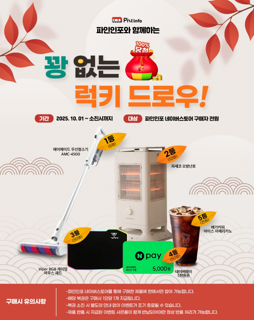 IT 전문 유통사 파인인포가 오는 10월 1일부터 소진 시까지 네이버스토어 전 채널에서 ‘꽝 없는 럭키드로우 이벤트’를 진행한다. 이번 이벤트는 추석을 맞아 소비자들에게 풍성한 혜택을 제공하기 위해 마련됐으며, 파인인포가 유통하는 인기 가전제품부터 기프티콘까지 총 500만원 규모의 경품이 준비됐다.