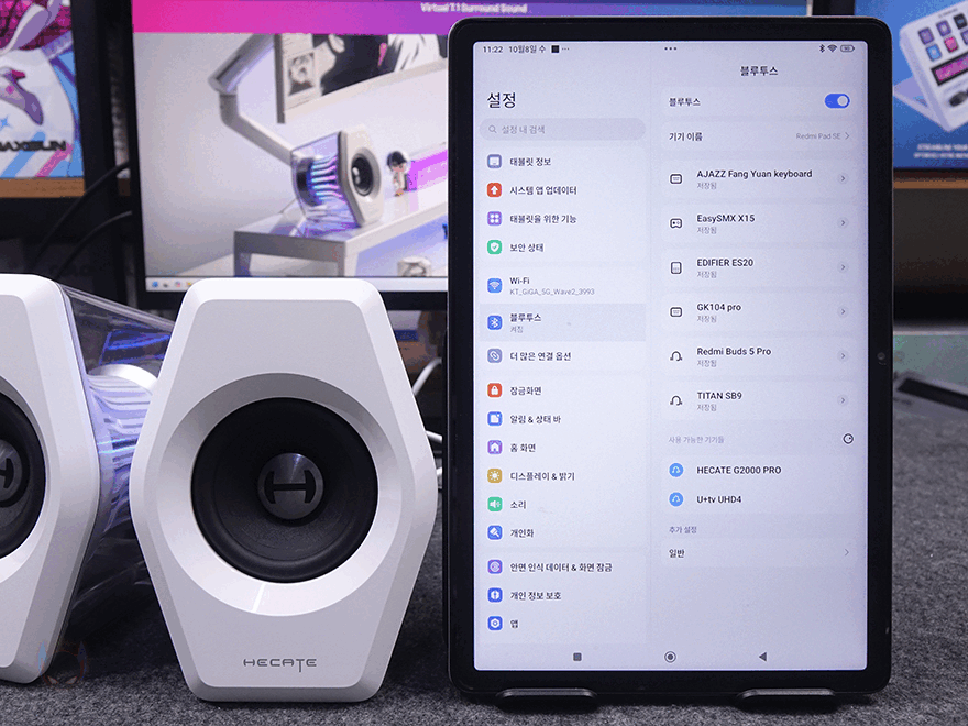 스피커 연결방식은 방금 언급했듯이 AUX, USB, 블루투스(Bluetooth) 3가지 모두 지원합니다. AUX와 USB는 각각 제공되는 케이블을 사용해 PC/노트북/모바일/게임 콘솔기기에 선택적으로 연결하면 되고, 블루투스 같은 경우에는 스피커에서 연결모드를 블루투스로 선택한 후, 연결할 기기에서 검색을 통해 'HECATE G2000 PRO'라고 검색되면 연결시켜 줍니다. 참가로, G2000 PRO 스피커 같은 경우에는 블루투스 연결만 지원하고, 에디파이어 오리지널 스피커 제품들에게 지원되는 Edifier ConneX 같은 앱 지원을 없습니다.