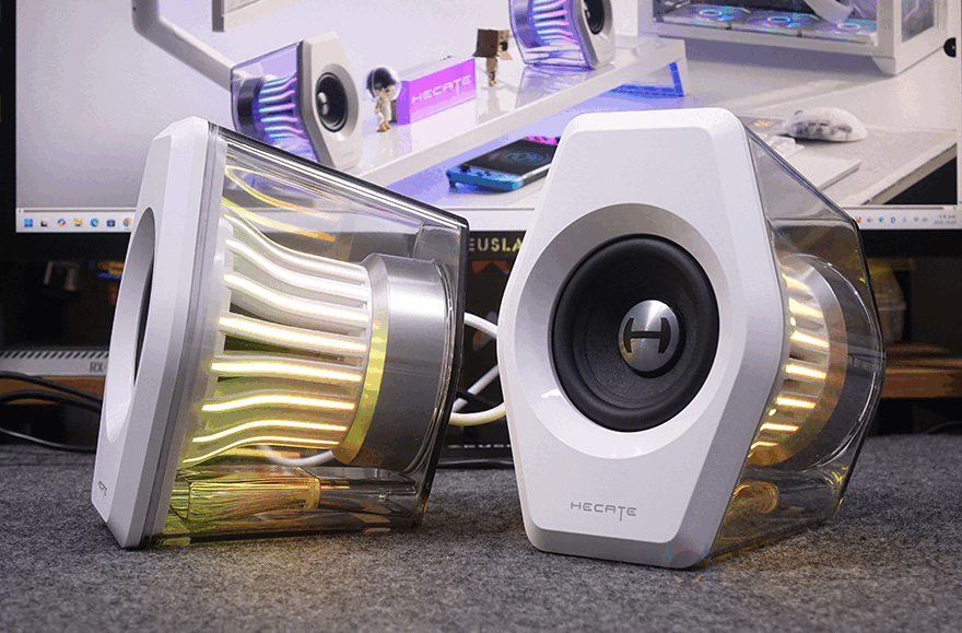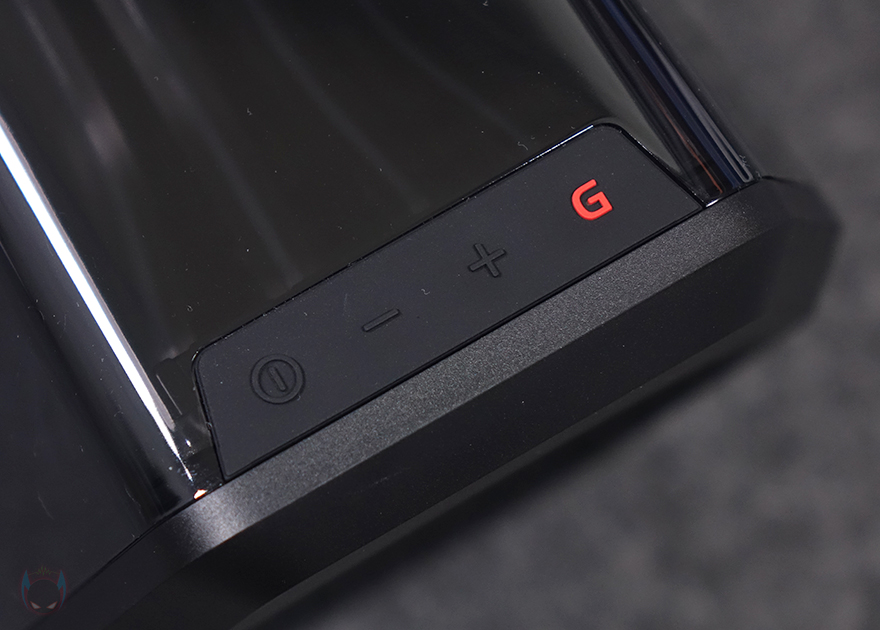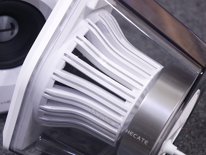 화이트 색상을 통해 인클로저(enclosure)부분을 좀 더 살펴보면, 인클로저 내부에는 드라이버 유닛을 가리면서, RGB 조명효과를 볼 수 있게 스트립 디자인이 적용되어 있는데, 총 20개 라인이며, 내부에는 총 100개의 LED가 적용되어 있습니다. 뒤에서 작동확인을 하겠지만, 에너지 임팩트 같은 분위기 연출을 줍니다. 그리고, 오른쪽 스피커 인클로저 측면에는 'DESIGN BY HECATE'를 새겨놨으며, 바닥 부분에는 앞뒤로 미끄럼방지 및 진동소음 최소화를 위해 패드가 부착되어 있죠. 또한, 인클로저 상단 맨 앞부분에는 버튼(Button)이 배치되어 있는데, 실리콘 재질 마감에 입체감 버튼으로 왼쪽부터 전원(Power) 버튼, 볼륨조절(Volume control), 사운드 모드(Sound Mode) 전환의 G 버튼이 배치되어 있죠. 그리고, 스피커 측면에서 보면 10˚정도 각도를 적용해 사용자에게 자연스러운 사운드 전달이 되도록 했습니다.