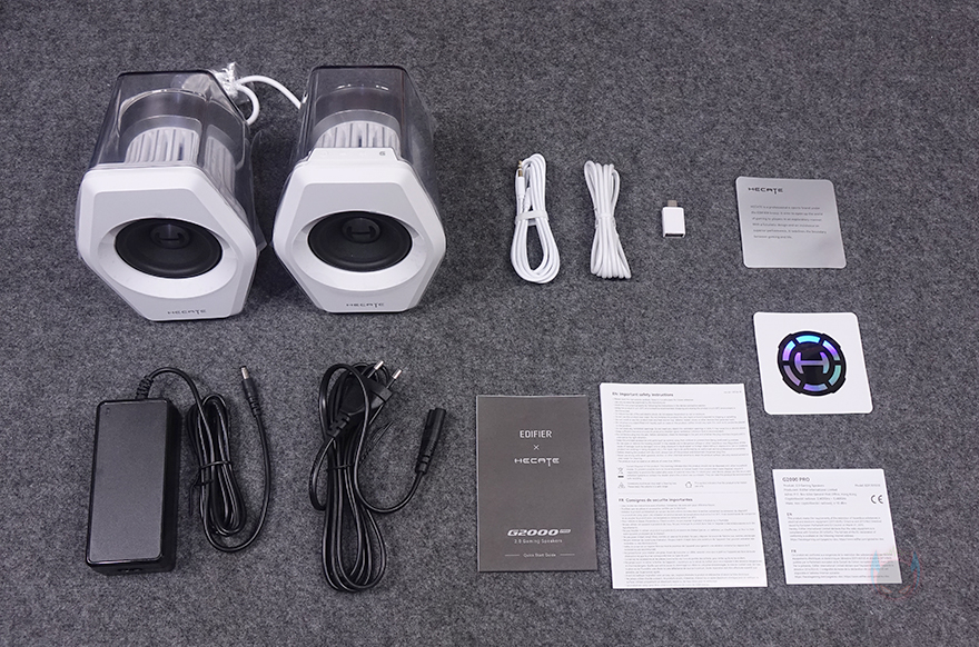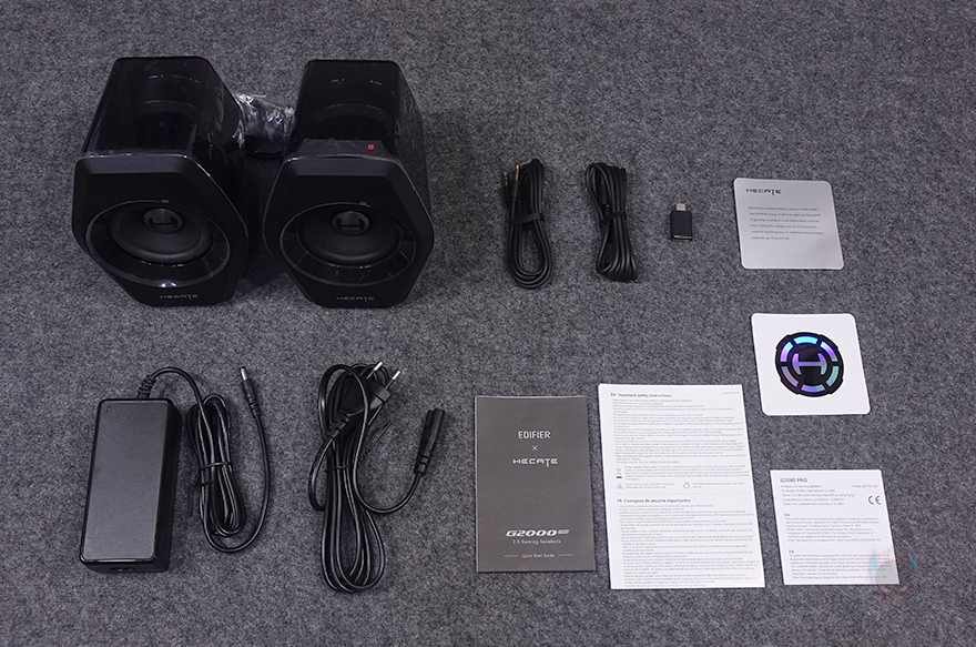 박스를 열어보면, 구성품이 담긴 별도의 박스 포장과 위아래 포장재 사이로 비닐 포장된 스피커를 확인할 수 있으며, 전체 제품 구성에는 G2000 PRO 스피커, AUX 케이블, USB 케이블, USB-A to C 어댑터, 전원 어댑터 및 케이블, 제품 설명서, 보증 및 인증서, HECATE 로고 스티커 제공으로 이루어져 있죠. 참고로, 블랙과 화이트 색상별 구성품 차이는 스피커, AUX 케이블, USB 케이블, USB-A to C 어댑터 색상차이뿐입니다. 그리고, 개봉 시 스피커 앞부분과 인클로저 부분에는 보호비닐이 부착되어 있습니다.