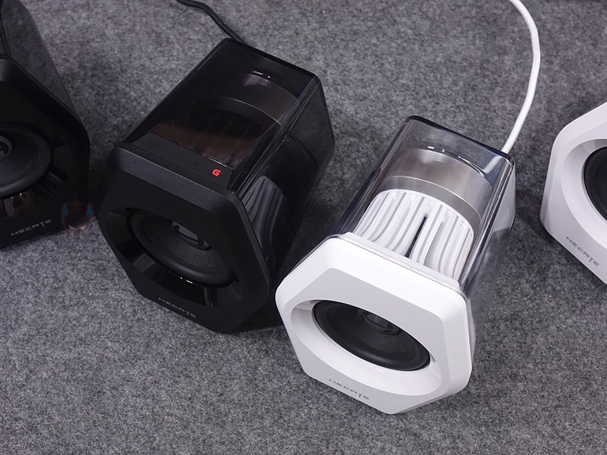 본격적으로 에디파이어 헤카테(Edifier HECATE) G2000 PRO 스피커를 살펴보면, 먼저 색상은 앞서 언급했듯이 블랙과 화이트 2가지이며, 전면 디자인은 이전 모델 G2000과 유사하지만, 뒷부분 인클로저부분은 완전히 다릅니다. 내부가 보이는 투명한 디자인(Clear design)을 적용했죠. G2000 PRO가 게이밍 스피커(Gaming Speaker)이고, 최근 PC시장에서 PC케이스 내부가 보이는 파노라마-뷰(Panoramic view) 디자인이 유행인 점을 반영해 적용했다고 짐작할 수 있습니다. 참고로, 블랙색상 같은 경우에는 스모크(Smoke)하게 처리했으며, 화이트 색상 같은 경우에는 완전히 보이는 투명으로 처리했으며, 고급스러운 분위기에는 블랙이 좀 더 낫고, 깔끔한 느낌은 화이트가 좀 더 낫은데, 블랙 같은 경우에는 먼지가 잘 붙기 때문에 관리가 필요합니다.