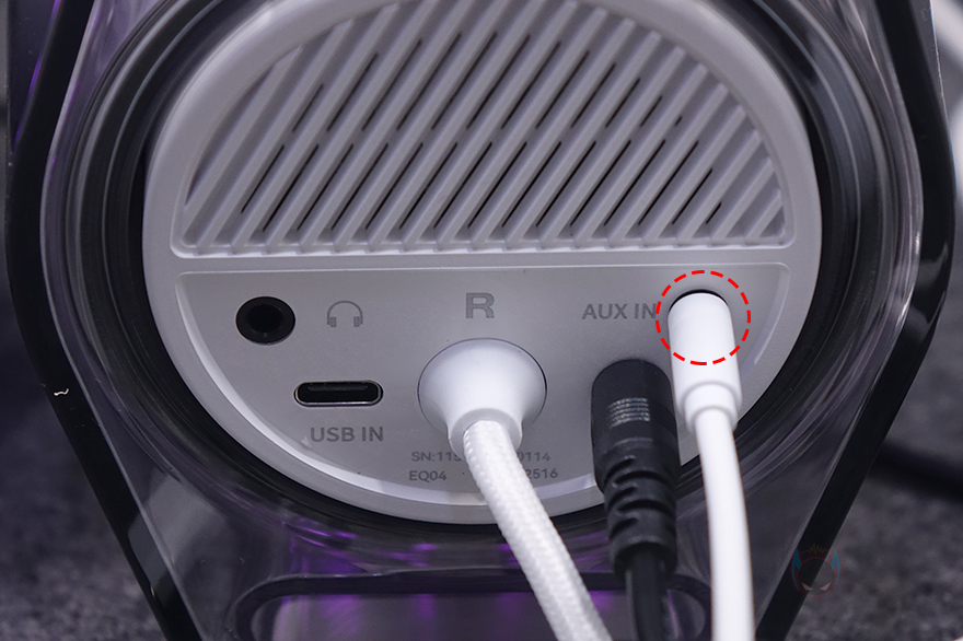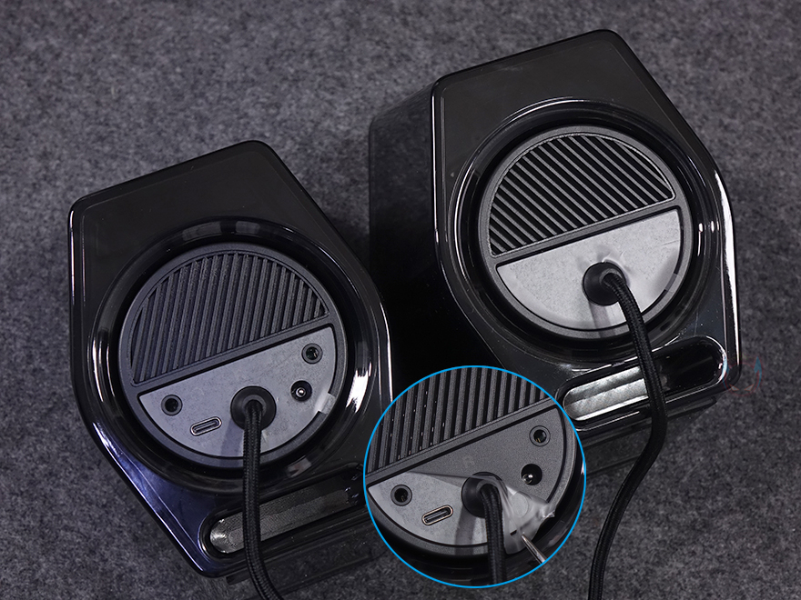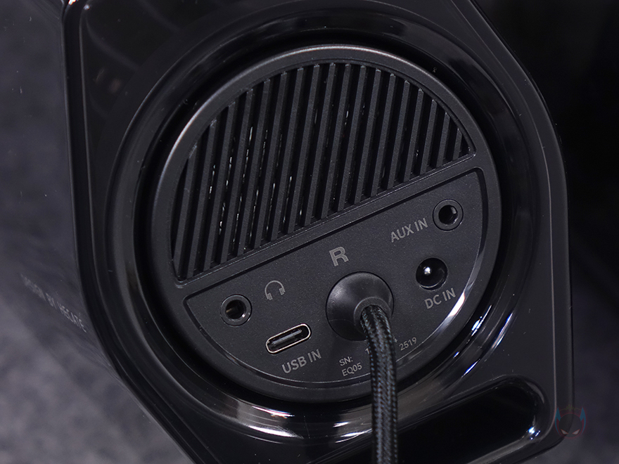 스피커 전면에는 3인치 크기의 대구경 풀-레인지(large-diameter full-range) 드라이버 유닛이 적용되어 좌우 스피커 각각 16W 출력으로 총 32W(RMS) 출력을 지원하고 있으며, 최대 출력(Peak power)은 64W입니다. 유닛 하나로 고/중/저음 대역을 들려줘야하기때문에 내부에는 사운드 선명도를 위해 듀얼 네오디뮴 자석이 적용되어 있죠. 그리고, 스피커 후면에는 원형 베이스 디자인에 윗부분은 내부 열 배출을 위한 에어그릴 디자인이 적용되어 있으며, 개봉 시에 베이스 부분에 보호비닐이 부착되어 있습니다. 또한, 오른쪽 스피커 후면에는 포트들이 배치되어 있는데, 왼쪽에는 헤드폰 포트와 USB 포트, 오른쪽에는 AUX와 전원 DC 포트가 적용되어 있죠. 스피커 후면 양쪽 아래에는 저음 확장과 왜곡 최소화로 베이스 향상을 위해 덕트 디자인이 적용되어 있고, 좌우 스피커 연결 케이블은 총 1.45m 길이에 직조케이블을 적용했습니다.