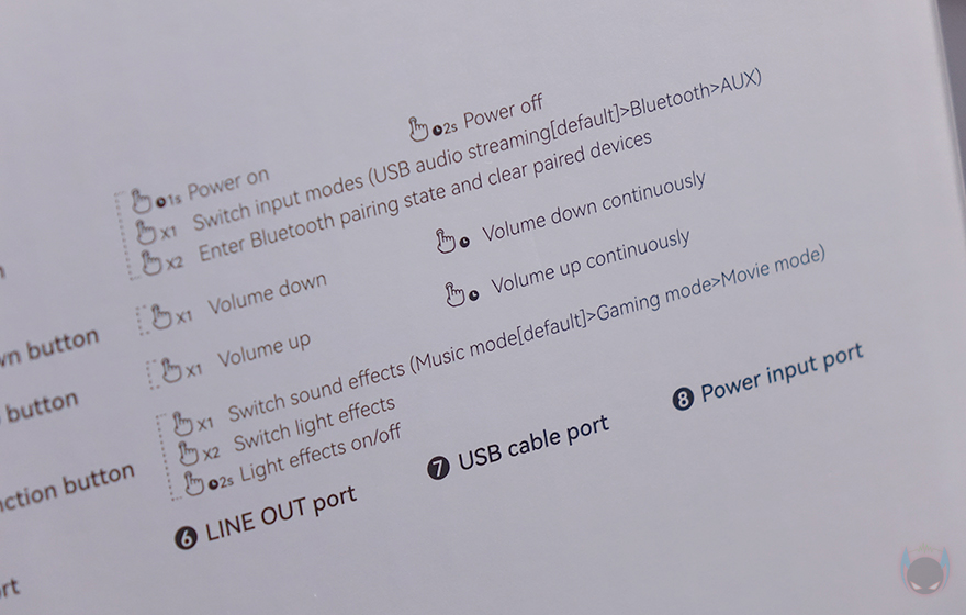직접, 에디파이어 헤카테(Edifier HECATE) G2000 PRO 스피커를 사용해보면, 먼저 PC와 연결해 전원버튼을 켜면 바로 스피커 뒷부분 인클로저 내부에 RGB 조명효과를 확인할 수 있습니다. 앞서 언급했듯이 화이트 색상은 인클로저 부분이 투명하게 처리되어서 전체적인 조명효과를 극대화로 볼 수 있고, 블랙 색상 같은 경우에는 스모크 하게 처리되어서 조명부분만 강조되게 보이는 효과가 있습니다. 따라서, 화이트, 블랙 색상 취향뿐만 아니라 조명효과도 취향적으로 선택될 수 있는 부분이라 생각됩니다. 그리고, 상단에 배치된 버튼 중 볼륨조절 버튼을 제외한 나머지 버튼에 대해서 언급하자면, 일단 전원버튼은 1초 이상 누르고 있으면 전원 On, 2초 이상 누르고 있으면 Off를 할 수 있고, 전원 On/Off 때 효과음이 나옵니다. 그리고, 전원이 켜진 상태에서 한 번씩 누르면 연결모드 전환을 할 수 있는데, 두(du) 소리가 나오면 블루투스(Bluetooth), 두두(dudu) 소리가 나오면 AUX, 두두두 소리가 나오면 USB 연결모드입니다. 또한, G버튼 같은 경우에는 2번 연속으로 누르면 조명모드를 전환할 수 있는데, 전원을 켰을 때 기본작동하는 모드는 COLORFUL이고, 다음으로 METEOR→COLOR BLOCK→BREATHE→CONSTANT→COLOR BLOCK→HEART BEAT순 모드로 전환됩니다. 참고로, 소리에 반응하는 모드는 HEART BEAT입니다. 그리고, G버튼을 1번씩 누르면 사운드 모드(Sound mode)를 전환할 수 있는데, 블루(Blue)으로 깜빡이면 영화(Movie) 모드, 퍼플(Purple) 색상으로 깜빡이면 음악(Music) 모드, 레드(Red) 색상으로 깜빡이면 게임(Gaming) 모드입니다. 또한, 각 사운드 모드 전환 시 효과음도 다르게 해서 구분시켜 줍니다. 참고로, G 버튼을 2초 이상 누르면 조명효과를 On/Off 할 수 있고, 전원 On/Off 시 효과음을 On/Off 하고 싶을 때는 전원(Power)+볼륨업(Volume +) 버튼을 2초이상 누르면 되고, 설정초기화(Reset)는 전원+G 버튼을 5초 이상 누르고 있으면 됩니다.