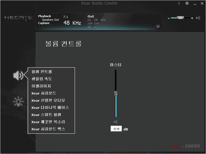 대신에 게이밍 스피커인만큼 PC에서 사용할 수 있는 전용 프로그램을 제공하는데, 홈페이지에서 다운로드(https://hecategaming.com/en-global/pages/driver-download-center) 받아 설치 후 실행해보면, 사운드 설정과 조명 설정 2가지 메인 메뉴를 확인할 수 있습니다. 사운드 설정에서는 마우스 더블 클릭이나 오른쪽 버튼을 클릭하면 볼륨 조절을 비롯해 총 9가지 서브 메뉴가 다시 나오는데, 이퀄라이저부터 가상 7.1 채널 서라운드 설정까지 사용자 취향으로 설정할 수 있습니다. 특히, 서라운드 설정 부분이 6가지라서 방향, 선명도, 베이스 등 세부적으로 조절할 수 있습니다. 그리고, 조명 설정에서는 앞서 확인한 모드 설정 부분과 추가로 색상 설정을 할 수 있으며, 프로그램은 한국어도 지원하고 있습니다.
