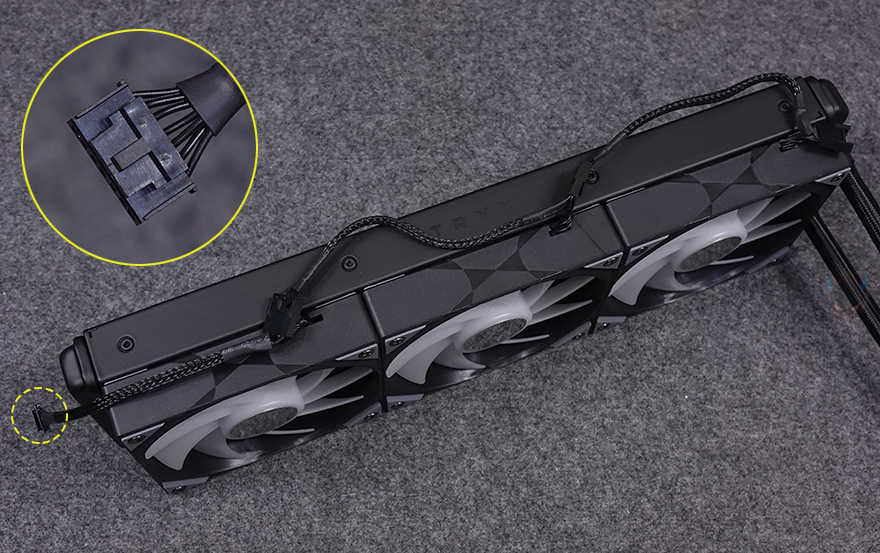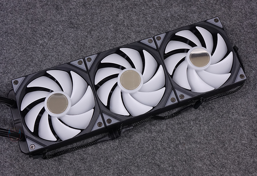 본격적으로 TRYX(트라익스)의 PANORAMA 3D SE 360 일체형 수랭쿨러를 살펴보면, 색상은 먼저 출시했던 모델과 마찬가지로 PANORAMA 3D SE 360도 블랙과 화이트 2가지 색상으로 출시했습니다. 그리고, 외형적으로 봤을 때도 PANORAMA 3D 모델과 큰 차이가 없는 거 같지만, 하나씩 살펴보면 꽤 차이가 있는데, 일단 PANORAMA 3D SE 360 라디에이터에 기본 장착된 3개의 120mm 팬은 ROTA ARGB 팬으로 동일한 제품을 사용했습니다. 9개의 날개와 FDB(Fluid Dynamic Bearings) 베어링, 500~1850 RPM 속도범위를 가졌으며, 팬 가운데 부분은 메탈릭으로 사물이 비칠 정도로 반사율을 가지고 있습니다. 물론, 3개의 팬 모두 7핀 커넥터 케이블로 일종의 데이지 체인처럼 깔끔하게 정리되어 있고, 한쪽에는 제공되는 팬&ARGB 어댑터 케이블과 연결됩니다.