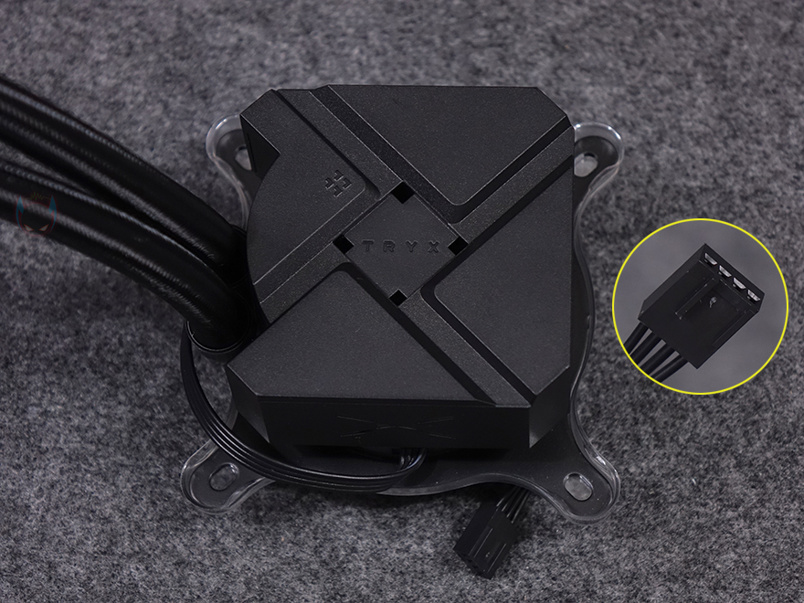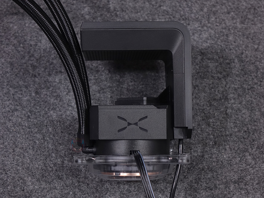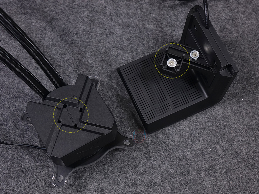 그리고, 커브드 디스플레이 상부 안쪽에는 내부 발열 배출을 위해 에어홀 디자인을 적용해놨으며, 디스플레이 작동 연결방식은 기존과 동일하게 메인보드 내부 USB 헤더 연결입니다. 또한, 워터블록의 작동 연결방식은 4 pin 방식이고, 펌프모터 속도는 최대 3600(±400) RPM으로 이전 모델보다 높아졌기 때문에, 같은 Asetek 냉각 솔루션이라도 세대차이가 있음을 짐작할 수 있죠. 여기에 워터블록에 기본 장착된 공용 마운팅 브래킷 역시 이전 모델과 디자인이 다른 걸 확인할 수 있고, CPU와 맞닿는 베이스 부분은 구리재질 그대로 매끄럽게 래핑처리된 걸 확인할 수 있습니다.
