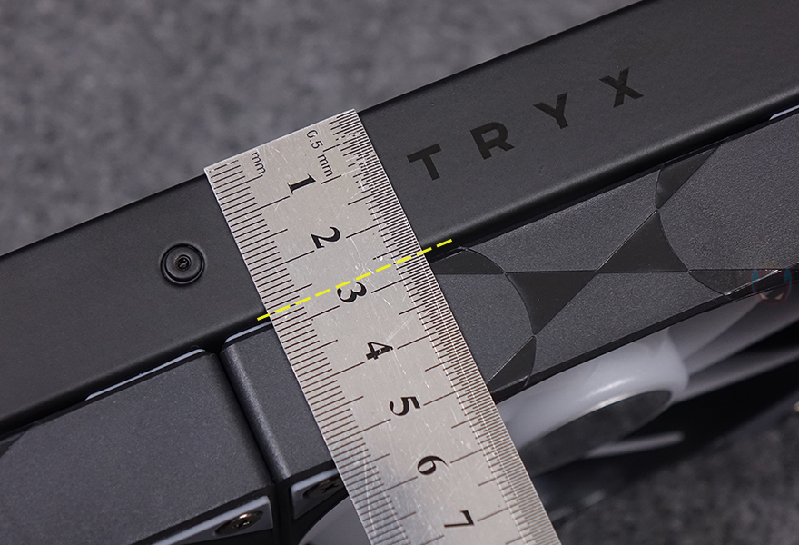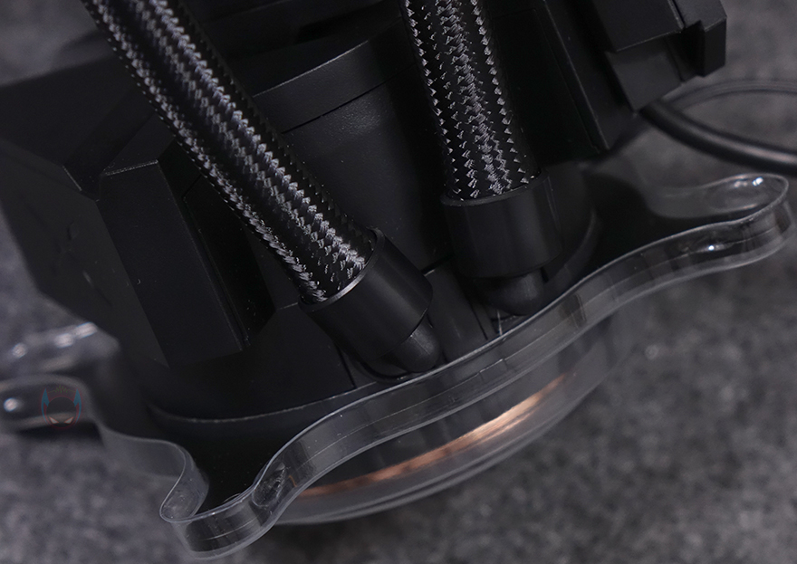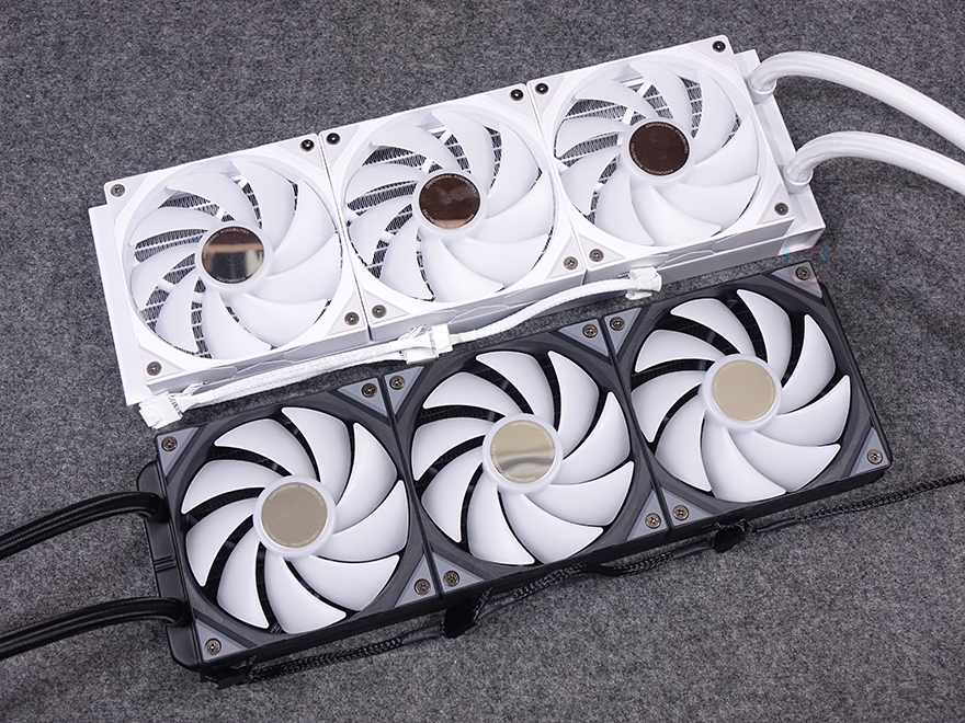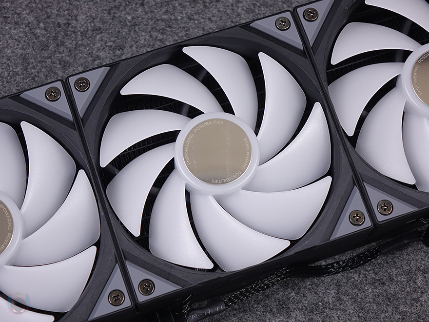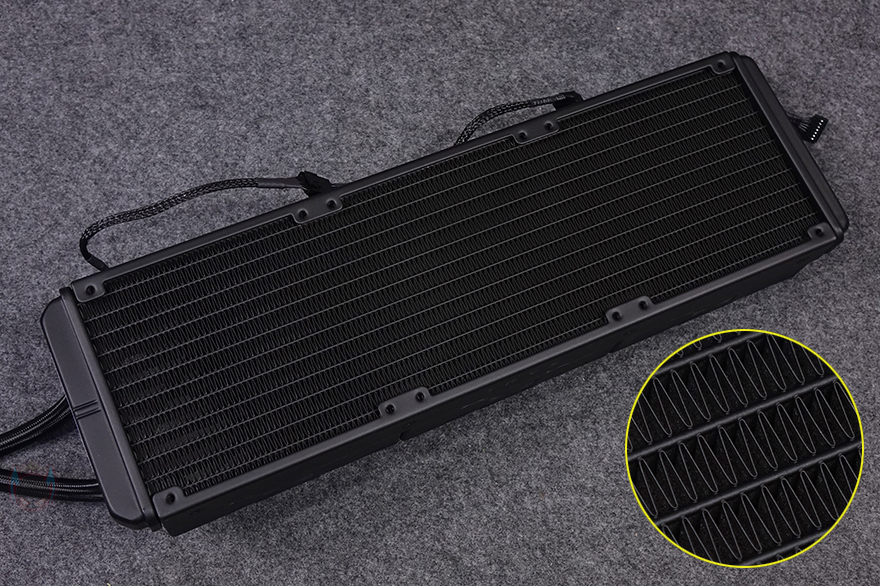 그리고, 팬 나사를 풀면 당연히 분리가 가능하고, 방향을 바꿀 수 있으며, 라디에이터 반대쪽도 추가 팬 즉, 듀얼 팬 구성이 가능하도록 나사홀이 처리되어 있죠. 방열핀들은 일정한 간격으로 적용되어 있으며, 라디에이터 두께는 먼저 출시했던 PANORAMA 3D 모델에서는 30mm 두께였지만, 이번 PANORAMA 3D SE에서는 표준 두께라 할 수 있는 27mm를 적용했습니다. 그리고, 라디에이터와 워터블록을 연결하는 튜브 좀 더 길어진 450mm를 가졌으며, 전체 슬리빙 처리와 양쪽 연결부 모두 누수가 발생되지 않도록 깔끔하게 처리되어 있죠.