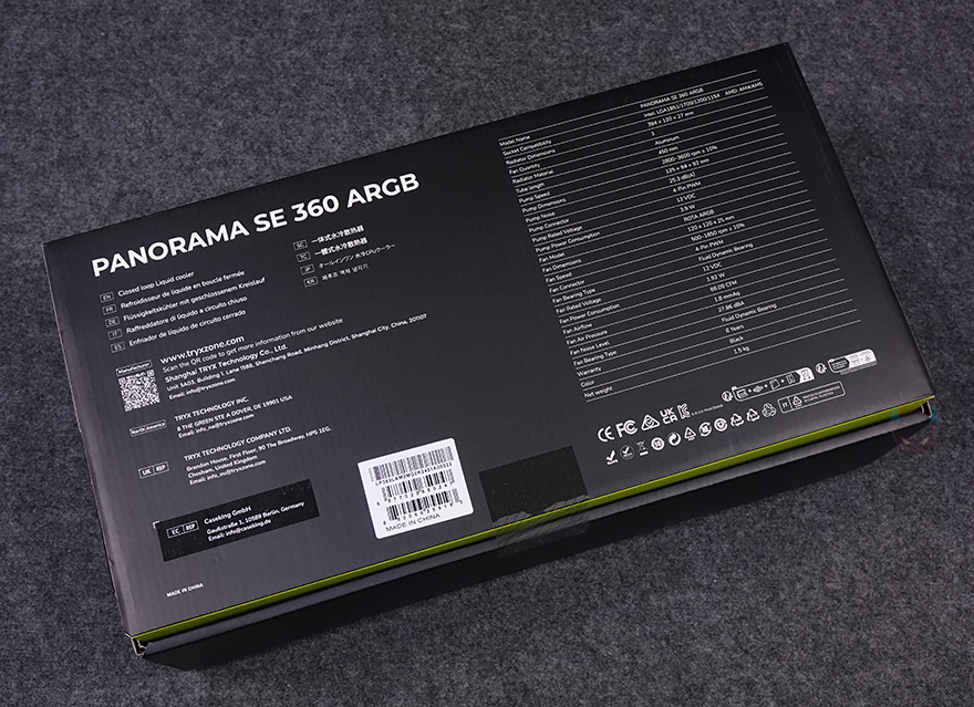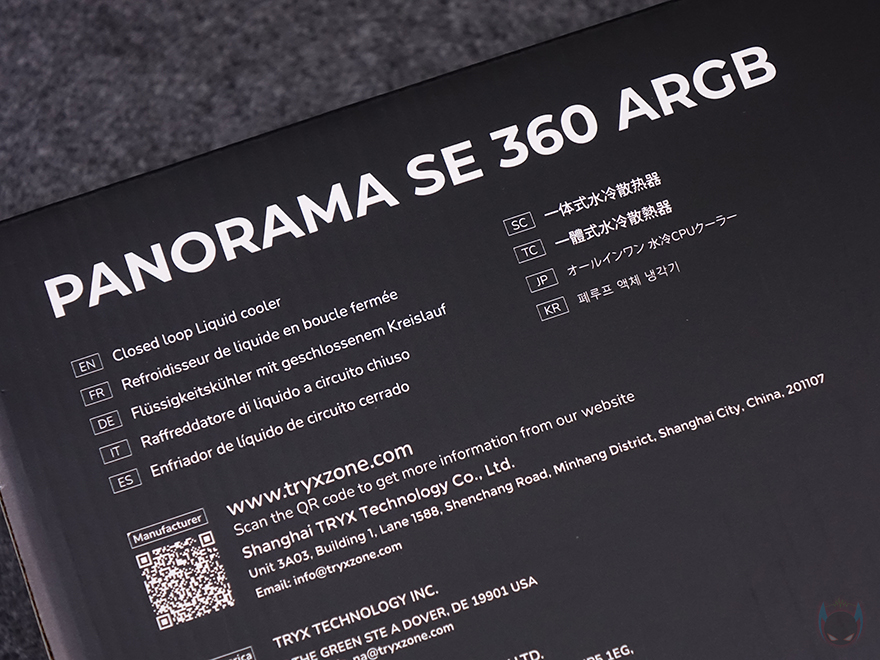 제품 패키지부터 살펴보면, 제품 박스는 먼저 출시했던 PANORAMA 3D와 마찬가지로 박스 전체 밀봉처리를 해놨습니다. 소비자입장에선 아무래도 이런 포장이 좀 더 판매제품에는 신뢰가 가죠. 그리고, PANORAMA 3D 제품박스 같은경우에는 제품 이미지를 담지 않았던 반면, PANORAMA 3D SE는 전면에 제품 이미지를 담고 있습니다. 360mm 라디에이터 제품이기 때문에 당연히 해당 모델 이미지를 담고 있죠. 참고로, PANORAMA 3D SE 모델 같은 경우 240mm 라디에이터 제품도 있지만, 국내에는 수요가 적기 때문에 360mm 라디에이터 모델만 출시했습니다. 그리고, 같은 라인업 제품이기 때문에 주요 특징인 커브드 디스플레이 요점을 표기해 놨으며, 후면에는 제품의 기본 사양 표기를 해놨습니다. 뒤에서 확인하겠지만, 팬 사양은 동일하고, 라디에이터와 워터블록에서 차이를 두고 있죠.