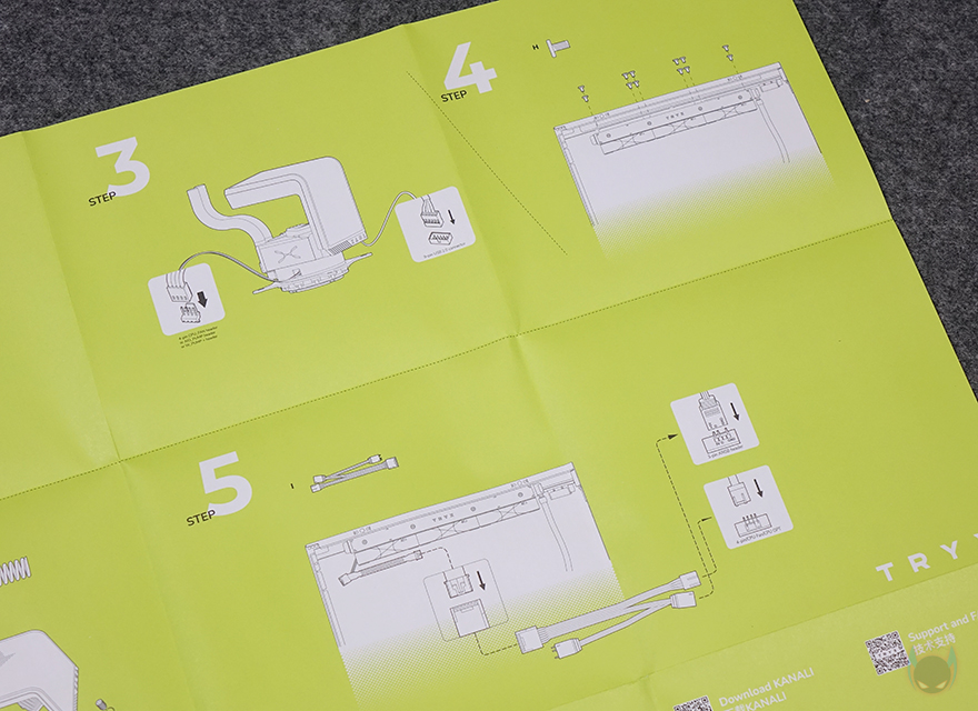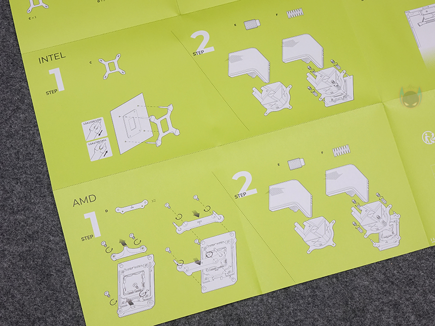 박스에 붙은 봉인씰 제거해서 열어보면, 포장은 먼저 출시했던 PANORAMA 3D 제품보다 더 깔끔합니다. 쿨러를 제외한 나머지 구성품들도 별도의 박스 포장을 했고, 메뉴얼도 별도의 박스에 수납되어 있습니다. 전체적인 제품 구성도 좀 더 간소화되었는데, 본 제품인 PANORAMA 3D SE 360 수랭쿨러, 인텔용 백플레이트, AMD용 어댑터 브래킷, 인텔&AMD 공용 마운팅 스프링 및 너트, 팬&ARGB 어댑터 케이블, 써멀 그리스, 라디에이터 나사들, 제품 설명서로 이루어져 있죠. 먼저 출시했던 PANORAMA 3D ARGB 모델에서 제공되던 ARGB 컨트롤박스가 PANORAMA 3D SE에서는 제외되었습니다. 그리고, 제품 설명서는 기존 제품들처럼 그림으로 담아 쉽게 이해되도록 했죠.