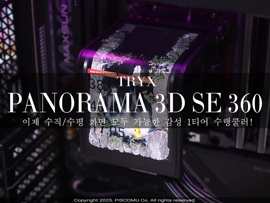 TRYX(트라익스)의 PANORAMA 3D 시리즈 수랭쿨러는 시작에서도 잠깐 언급했듯이 컴퓨터 어항케이스가 PC케이스 시장을 주도하는 시기에 등장해 바로 큰 인기를 얻었습니다. 컴퓨터 어항케이스가 선사하는 파노라마-뷰를 CPU 쿨러 그것도 수랭쿨러에 세계 최초 대화면 6.5인치 커브드 AMOLED 디스플레이를 적용해 가장 잘 어울리는 대표 감성 쿨러로 자리 잡았죠. 물론, 가격대가 높기 때문에 소비자입장에선 부담스러운 부분이 있었습니다. 그래서, 후속으로 등장한 PANORAMA 3D SE 360 수랭쿨러는 매우 반가운 제품이라 할 수 있죠. 특히, 가격부담도 줄어들었지만, 상위 모델 출시 후 그동안 컴퓨터 어항케이스를 비롯한 뷰-트렌드 역시 다각화가 있었는데, PANORAMA 3D SE 360는 그부분까지 고려해 커브드 디스플레이를 수평뿐만 아니라 수직방향으로도 바꿀 수 있게 갖추고 나왔습니다. 일반적인 컴퓨터 어항케이스뿐만 아니라 차별성을 두는 특정한 컴퓨터 어항케이스에서도 수랭쿨러 디스플레이를 원하는 방향으로 선택할 수 있는 거죠. 물론, PANORAMA 3D SE 360이 하위 모델이라 냉각성능에는 상위 모델과 차이를 두지만, 큰 차이는 아니고, 또한 이제는 수랭쿨러는 꼭 고성능 냉각성능을 위해서 장착하는 것보다 조립PC의 인테리어를 고려한 시각적인 부분으로 선택하는 소비자들이 많아져서, 오히려 디스플레이 방향까지 바꿀 수 있는 PANORAMA 3D SE 360이 더 끌릴 수 있습니다. 그리고, 원조 커브드 디스플레이 수랭쿨러답게 경쟁사들보다 소프트웨어부분도 가장 완성도 있게 갖추면서 계속 발전하고 있기 때문에 지속적인 쿨러 사용을 고려한다면, 역시 TRYX의 PANORAMA 3D 시리즈 쿨러가 최적이라 할 수 있죠. 어떤한 컴퓨터 어항케이스로 조립하더라도 수평/수직 원하는 방향으로 가장 감성적인 표현을 할 수 있는 디스플레이 일체형 수랭쿨러를 원한다면, TRYX의 PANORAMA 3D SE 360 쿨러를 추천합니다.