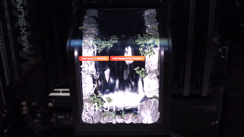 또한, PANORAMA 3D SE 360은 앞서 확인했듯이 커브드 디스플레이 방향을 수평방향뿐만 아니라 수직방향으로도 놓고 사용할 수 있는데, 수직 방향으로 놓고 사용할 시 이에 맞는 영상도 기본 영상에 포함되어 있습니다. 그리고, 영상 목록 위에 스크린 On/Off 버튼 옆 설정 버튼을 누르면 PANORAMA 3D SE에서만 지원하는 폭포모드가 있는데, 이는 수직방향으로 커브드 디스플레이를 놓고 사용할시 화면에 표시할 수 있는 시스템 정보 출력 방향을 수직방향이 맞게 변경해 줍니다. 조금 아쉬운 점이라면, 수직방향 영상이 하나만 기본 제공이라 좀 더 많았으면 좋지 않았을까 생각이 듭니다. 그리고, PANORAMA 3D SE 360 역시 사용자 설정을 통해서 별도의 MP4나 GIF 영상파일 또는 폭포모드 설정버튼 옆에 있는 스크린 녹화 기능을 통해 커스텀 영상을 저장해 커브드 디스플레이에 적용할 수 있죠. 이밖에도 프로그램 왼쪽 하단에 위치한 설정 메뉴로 들어가면 온도 표시나 프로그램 업데이트, 제품 펌웨어 업데이트 등을 진행할 수 있습니다.