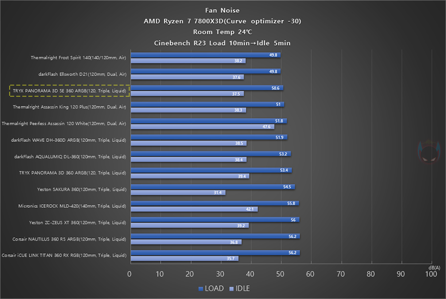 끝으로, PANORAMA 3D SE 360 일체형 수랭쿨러의 냉각 성능을 확인해보는데, 시스템 기반은 AMD 라이젠 7 7800X3D CPU이며, 최근 CPU들은 높은 부스트 클럭을 갖추고 있기 때문에, 예전처럼 수동 오버클럭의 매력이 사라졌습니다. 테스트에 사용된 AMD 라이젠 7 7800X3D CPU 역시 인기가 많지만, 수동 오버클럭보다는 AMD 자체에서 성능향상으로 다룰 수 있는 PBO나 커브옵티마이저(-30) 설정으로 더 많이 사용하죠. 그래서, 쿨러 테스트 역시 커브옵티마이저(-30) 설정으로 적용해서, 10분간 과부하 Load로 씨네벤치 R23을 실행하고, 과부하 후 5분간 Idle로 돌아가는 상황에서 CPU의 온도와 팬 속도, 쿨러 소음, 쿨링성능에 따른 부스트 작동 최대 클럭을 확인해 봤습니다. 최대한 비슷한 환경조건을 위해 실내 온도와 동일한 써멀 그리스를 사용했습니다.