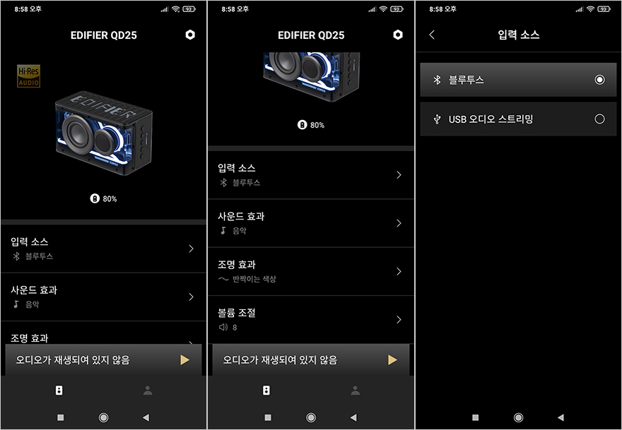 연결방식은 무선방식의 블루투스(Bluetooth)와 유선방식의 USB 2가지로 먼저, 블루투스 연결은 일반적인 블루투스 페어링 연결방식과 같습니다. 개봉 후 처음 사용시에는 전원만 켜도 자동으로 블루투스 모드에서 페어링 모드가 시작되는데, 만약 페어링 모드가 시작되지 않는다면, 전원 버튼 아래 위치한 블루투스 버튼을 1.5초 이상 누르고 있으면 페어링 모드가 작동됩니다. 페어링 모드가 작동되면 연결한 기기에서 블루투스 검색을 통해 'EDIFIER QD25'가 검색되면 연결해 주면 되죠. 그리고, 블루투스 연결 시 에디파이어의 공용 앱인 ConneX 역시 사용할 수 있게 지원하고 있는데, 정상적으로 연결되면 앱에서 장치 인식을 메인화면에서 볼 수 있고, 배터리 잔량과 함께 입력소스/사운드효과/조명효과/볼륨조절 크게 4가지 메뉴를 확인할 수 있습니다. 입력소스는 연결방식 선택이고, 사운드효과는 음악/게임/영화/실외/커스터마이즈 총 5가지 사운드모드를 지원하며, 조명효과는 앞서 잠깐 언급했듯이 총 7가지 모드를 지원하고, 볼륨조절은 최대 16단계 조절 지원합니다. 참고로, 볼륨조절은 모바일기기 연결시 기기 볼륨기준으로 작동됩니다. 이밖에도 앱에 있는 디바이스 설정으로 들어가면, 추가로 조명모드 버튼 6가지 설정과 절전모드 On/Off, 최대볼륨, QD25 2대 연결시 스테레오 페어링 On/Off, 전원 예약설정을 할 수 있습니다. 그리고, PC나 노트북 등에 유선으로 연결하는 USB 방식 경우에도 에디파이어 PC버전 공용 소프트웨어 TempoHub를 사용할 수 있게 지원하는데, 기능은 ConneX의 거의 동일하기때문에 앱처럼 익숙하게 사용할 수 있습니다. 참고로, 블루투스와 USB 연결시 측면 전원버튼에도 LED로 연결표시를 구분해 주는데, 블루투스일 때는 블루(Blue), USB 연결일 때는 레드(Red)로 표시됩니다. 그리고, 사운드에 반응하는 조명효과는 TempoEmo입니다.