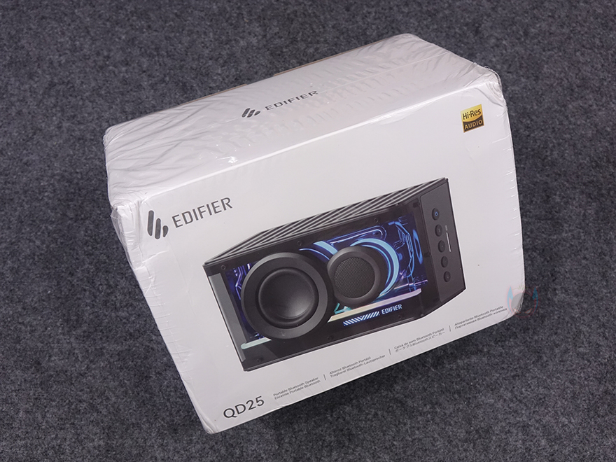 제품패키지부터 살펴보면, 뒤에서 크기를 확인하겠지만, 이번 QD25는 이전 QD35보다 크기도 확 줄어들었습니다. 그래서, 제품 박스 역시 작아졌고, 다른 포터블 블루투스 스피커 제품들처러 박스 전체 밀봉처리가 되어 있죠. 박스 전면에는 모델명과 함께 제품 색상에 맞춰 제품 이미지를 담고 있으며, 이전 QD35와 마찬가지로 QD25도 2가지 컬러로 출시했습니다. 박스 한쪽 측면에는 다국적 언어로 제품의 주요 특징을 표기해 놨는데, 총 출력, 드라이버 유닛, Hi-Res 오디오 지원, 블루투스 6.0, 최대 재생 시간, 조명효과, USB-C 입력, 공용 앱 지원을 언급하고 있죠. 그리고, 이 제품은 이미 국내에도 정식출시했기 때문에, 반대쪽 측면에 한국 KC인증도 확인할 수 있습니다. 박스 후면에는 제품 색상 구분과 함께 측면에서 언급한 주요 특징을 내용을 다시 한번 더 확인할 수 있습니다.