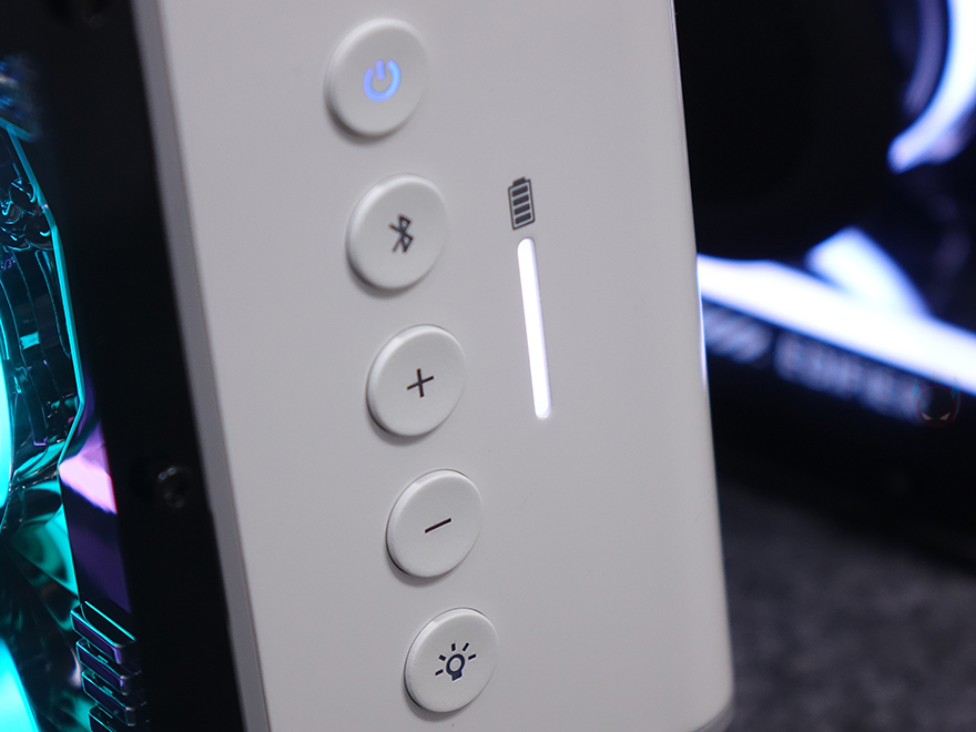 직접, 에디파이어(Edifier) QD25 포터블 블루투스 스피커를 사용해 보면, 전원버튼을 1.5초 이상 누르고 있으면 전원이 켜지는데, 전원 켜짐과 동시에 기존 QD35 모델처럼 전면에 조명효과(Lighting effects)를 볼 수 있습니다. 뒤에서 다시 확인하겠자만, 조명효과는 총 7가지 모드를 지원하고 있으며, 측면 조명모드 버튼 사용 시에는 6가지 모드로 전환할 수 있고, 앱 사용시 7가지 모드 모두 전환할 수 있죠. 그리고, 측면 버튼 옆에 배치된 배터리 잔량도 화이트(White) LED로 점등된걸 확인할 수 있습니다. 참고로, 전원이 켜진 상태에서는 전원버튼이 재생/일시정지버튼 역할을 하고, 블루투스 버튼은 유무선 연결방식 전환, 볼륨조절은 길게 누르고 있을시 이전곡/다음곡 기능으로 작동됩니다.