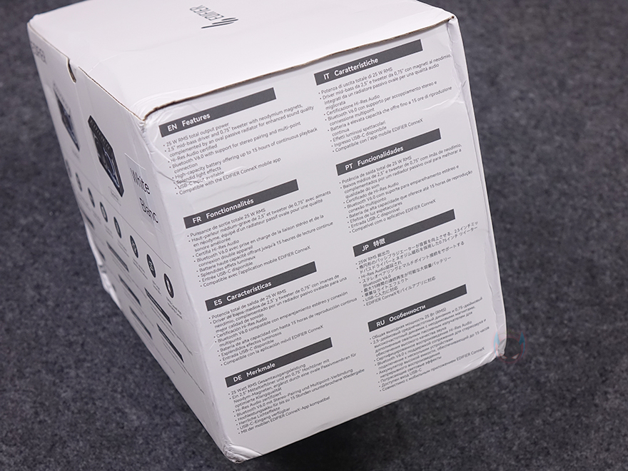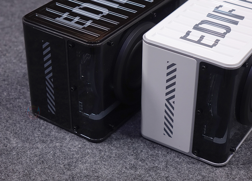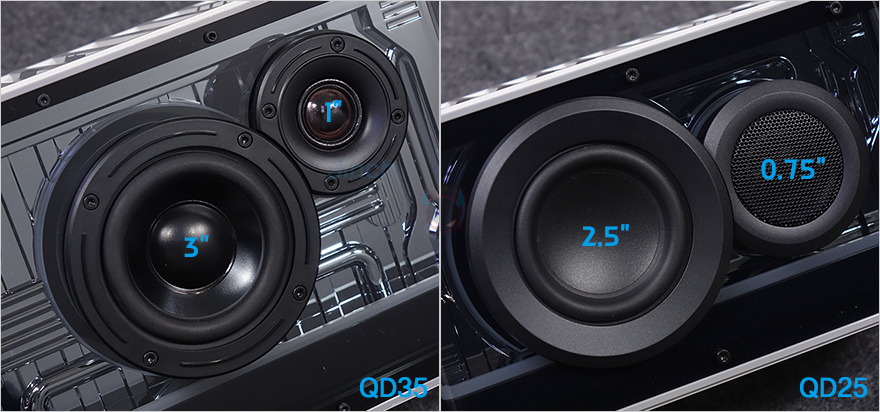 부위별로 좀 더 자세히 살펴보면, 전면에는 QD35와 마찬가지로 중/저음 담당의 미드 베이스 드라이버(mid-bass drivers)와 고음 담당의 실크-돔 트위터(silk dome tweeters)가 배치되어 있는데, QD35에서 3인치와 1인치였던 크기는 QD25에서 2.5인치와 0.75인치로 줄어들었지만, 앞서 확인한 제품 전체 크기가 줄어든 비율과 고려해 보면, 유닛은 정말 최소한으로 줄였다고 볼 수 있습니다. 그래서, 유닛 재질도 QD35에서는 알루미늄 합금이었지만, QD25에서는 네오디뮴으로 출력에 신경을 썼습니다. 참고로, QD35에서는 총 40(25+15)W 출력이었고, QD25는 총 25(15+10)W 출력을 지원합니다. 그리고, 스피커 상단 디자인은 기존과 동일하게 컨테이너 박스 영감으로 적용했으며, EDIFIER 로고를 새겨놨죠.