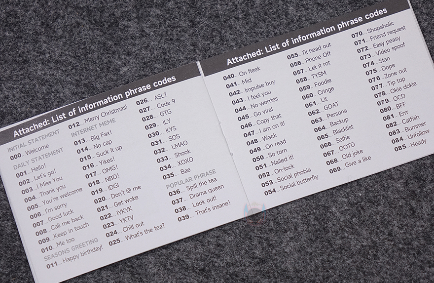 끝으로, BEEPER 보조배터리의 충전기능 외에 또하나의 기능이 있는데, 바로 메시지 기능입니다. 첫 줄에 나오는 메시지를 편집모드(Edit mode)로 누르면 바뀌는 걸 확인할 수 있고, 내장된 메시지가 랜덤으로 나옵니다. 메시지는 총 86개이며, 제품설명서에 번호별로 메시지 내용이 담겨 있으며, 만약 원하는 메시지를 보고 싶다면, 편집모드 버튼을 3초 이상 누르고 있으면 됩니다. 그러면, 메시지 번호를 선택할 수 있는 입력모드가 나오고, 번호를 입력하면 해당 번호의 메시지가 나오는 걸 확인할 수 있죠. 또한, BEEPER 보조배터리를 2개 사용하면, 삐삐(BeepBeep)를 사용하던 그 시절처럼 전화로 메시지를 남기고, 확인하던 감성처럼 메시지 목록에서 메시지를 선택해서 편집모드 버튼 왼쪽에 있는 보내기 버튼을 통해 서로 주고받을 수 있습니다.