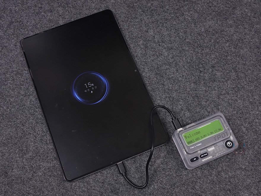 직접, Trozk의 BEEPER 보조배터리를 사용해보면, 전원버튼을 누르면 바로 전원이 켜지면서 2.4인치 와이드 스크린(Wide screen) 화면도 켜집니다. 참고로, 전원을 켰을 때 화면은 최대 밝기로 켜지는데, 버튼을 누르지 않고 가만히 10초 동안 있으면 자동으로 최대 밝기가 꺼지면서 배터리 소모를 1차적으로 줄입니다. 여기에 1분 동안 버튼을 누르지 않으면 자동으로 화면만 꺼지면서 배터리 소모를 알아서 최소화시키죠. 그리고, 화면에 첫 줄에는 내장된 메시지, 아랫줄에는 배터리 잔량과 충전상태를 표시해 주는데, 전압(V)과 전류(A), 전력 모두 표시해 줘서 실시간 작동상태를 확인할 수 있습니다. 충전 기능은 그냥 바로 충전케이블을 연결하면 작동하기 때문에 특별한 게 없고, USB Type-C가 최대 30W까지 지원하기 때문에 스마트폰/태블릿 PC 같은 모바일기기 또는 휴대용 스피커 같은 소형 전자제품들은 Type-C로 충전하면 무난하고, 무선 이어폰이나 스마트워치 같은 웨어러블 장치를 충전할 때는 전원버튼을 3초 이상 누르고 있으면 저전력 모드(Low current)로 전환되기 때문에, 저전력 모드로 충전하면 됩니다. 그리고, USB Type-C로 BEEPER 보조배터리를 충전하면 최대 20W로 작동되는 걸 확인할 수 있죠.