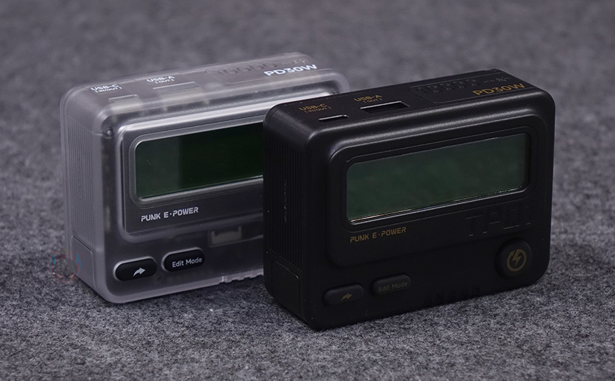 물론, BEEPER 보조배터리가 실제 삐삐보다는 좀 더 큰 사이즈지만, 전면에 삐삐(BeepBeep)에서 메시지를 확인할 수 있었던 스크린과 버튼 배치를 그대로 옮긴듯 동일한 위치에 적용하고 있습니다. 특히, 블랙색상 같은 경우에는 삐삐 색상이 대체로 블랙색상이었기 때문에 더 레트로 감성을 느끼게 해 주죠. 뒤에서 확인하겠지만, BEEPER 보조배터리에 2.4인치 스크린(Screen) 화면에서는 메시지와 배터리 잔량 및 충전 상태를 확인할 수 있고, 아래 버튼은 왼쪽은 메시지 보내기와 편집모드(Edit mode), 오른쪽 버튼은 전원버튼(Power button)입니다. 그리고, 상단에는 왼쪽에 2개의 USB 충전포트가 배치되어 있는데, USB Type-C와 Type-A 포트로 Type-C 포트는 입출력(In/Out) 역할을, Type-A 포트는 출력 역할만 합니다. 출력은 Type-C 포트가 최대 30W, Type-A 포트가 최대 22.5W를 지원하고, Type-C 포트로 BEEPER 보조배터리 충전기 입력은 최대 20W입니다. 그리고, 포트 옆에는 방금 언급한 PD 30W 충전속도와 배터리 용량을 표기해 놨죠. 또한, 오른쪽 측면에는 메시지나 충전상태를 확인할 수 있는 LED 인디케이터가 배치되어 있으며, 후면 모서리 한쪽 부분에는 스트랩-줄을 걸 수 있는 홀이 처리되어 있죠. 후면에는 투명모델 같은 경우 내부 후면에 배터리가 내장된 걸 확인할 수 있는데, 5600mAh 배터리 2개가 들어있습니다. 그리고, 표면 디자인에도 나름 신경을 써서, 삐삐처럼 배터리가 들어가는 삽입구 표시를 해놨고, 표시 아래 배터리 커버 같은 부분에는 제품 사양표기를 해놨죠. 블랙색상에서 보면 이런 부분이 레트로 느낌을 더 잘 살리고 있습니다.