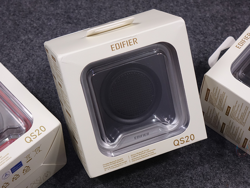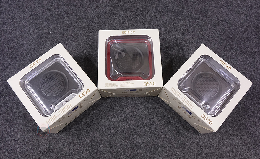 제품 패키지부터 살펴보면, 포터블 스피커인 만큼 작은 사이즈를 가져서 박스 크기도 작습니다. 그리고, 뒤에서 다시 확인하겠지만, QS20은 3가지 컬러로 출시했고, 색상구분이 쉽도록 내부 포장된 스피커를 외부에서도 확인할 수 있도록 모델명과 함께 박스 전면을 노출시켰습니다. 그리고, 박스 한쪽 측면에는 주요 특징으로 총 6W(RMS) 출력, 네오디뮴 자석(NdFeB) 드라이버 유닛, 블루투스 6.0 버전 지원, 최대 12시간 재생, IP67등급 방수, 내장 MEMS 마이크, 조명효과, ConneX 공용 앱 지원을 표기해 놨는데, 에디파이어 스피커에 관심이 있는 소비자라면, 이부분만 봐도 자사에 유사한 모델이 있었다는 걸 짐작할 수 있습니다. 바로, 먼저 출시했던 ES20입니다. 블루투스 버전, 재생시간, 조명효과를 제외하면 나머지 특징은 ES20과 동일하죠. 그리고, QS20은 국내에서도 정식출시한 모델이라 한국어로 기본 사양이 표기된 것도 확인할 수 있으며, 반대쪽 측면에는 다국적으로 한 번 더 주요 특징 표기를 확인할 수 있습니다. 또한, 박스 후면에는 방금 언급한 3가지 컬러의 제품 이미지를 확인할 수 있죠.