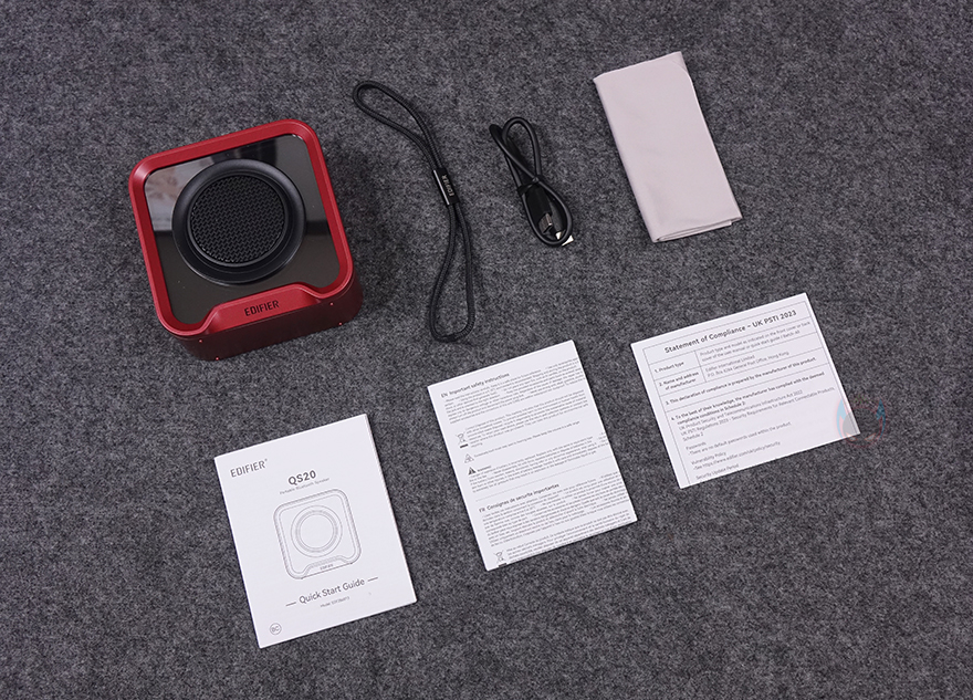 박스 봉인씰(Seal)을 뜯어서 열어보면, 스피커 크기에 맞춘 투명-캡 방식의 포장을 확인할 수 있으며, 포장재에 한 번 더 봉인씰을 뜯고 열어보면, 비닐포장된 QS20 스피커와 그 아래 나머지 구성품을 확인할 수 있습니다. 그래서, 전체 제품 구성은 QS20 포터블 블루투스 스피커, 스트랩, USB 충전케이블, 클린-천, 제품 설명서 및 지침서로 이루어져 있죠. 구성도 ES20과 유사합니다.