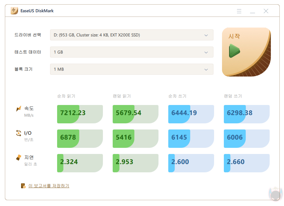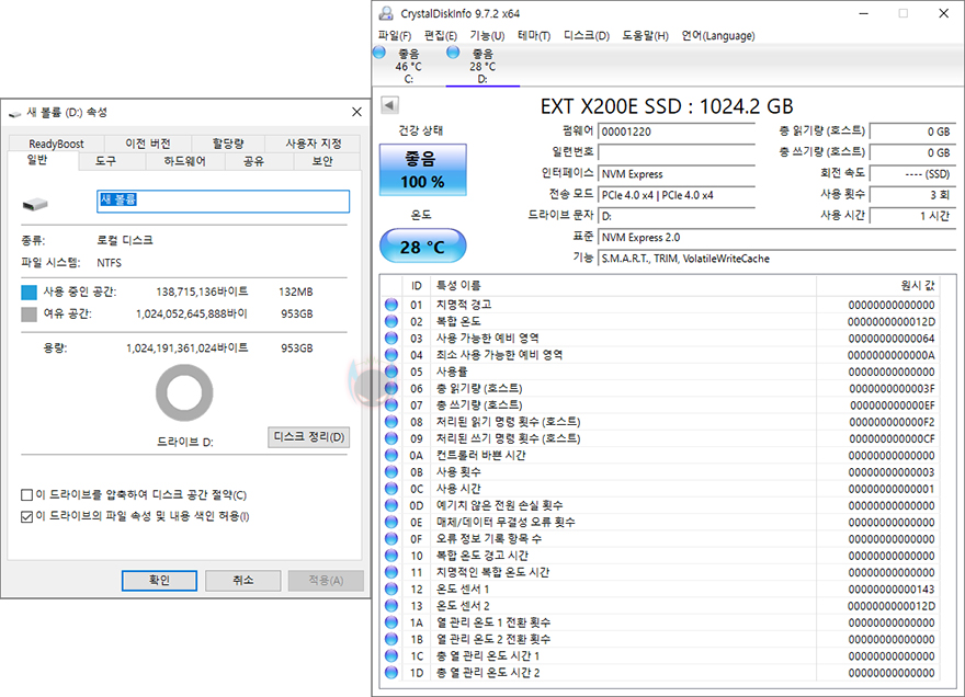 그럼, 이제 화웨이 eKitStor Xtreme 200E SSD의 성능을 확인해 보는데, 1TB 용량 기준으로 일단 처음 사용 시 윈도우 운영체제에서는 디스크 인식 과정을 거쳐야 합니다. 제어판→컴퓨터관리 →디스크관리로 들어가면 바로 팝업창이 뜨면서 안내에 따라 포맷 진행을 하면 초보자도 어렵지 않게 해당 모델 SSD 인식을 마칠 수 있으며, 정상적으로 포맷을 마치면 탐색기에서 드라이버 표기와 함께 용량 확인을 할 수 있습니다. 그리고, CrystalDiskInfo를 통해 제품 정보를 간단히 살펴보면, PCIe 4.0x4 규격과 함께 TRIM, 쓰기 속도 속도저하방지를 위한 VolatileWriteCache 기능이 적용된 걸 확인할 수 있죠. 또한, SSD 제조사들이 스펙 표기용 읽기/쓰기 속도로 많이 사용하는 CrystalDiskMark를 통해 eKitStor Xtreme 200E 1TB SSD 성능을 확인해 보면, 랜덤 무작위 접근과 순차접근 모두 최대 읽기 약 7200MB/s, 최대 쓰기 약 6300MB/s로 제품 스펙상의 속도와 PCIe 4.0x4 규격상의 최대 속도 오차범위 내에서 나오는걸 확인할 수 있습니다.