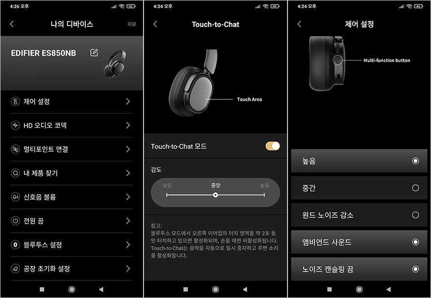 직접 에디파이어 ES850NB 무선 헤드폰을 사용해보면, 일단 메인 연결방식은 블루투스로 일반적인 블루투스 페어링 연결과 같습니다. 전원버튼을 1초이상 누르고 있으면 전원이 켜지고 켜짐과 동시에 페어링 모드가 자동으로 실행됩니다. 만약 페어링 모드가 작동하지 않을시에는 옆에 있는 블루투스 버튼을 3초이상 누르고 있으면 페어링 모드가 시작됩니다. 페어링 모드가 시작되면 연결할 기기에서 검색을 통해 EDIFIER ES850NB 모델이 검색되면 선택해서 연결해주면 됩니다. 블루투스 연결이 되면, 볼륨조절 버튼을 통해 통화와 재생 컨트롤을 할 수 있고, 블루투스 버튼을 통해서는 1번씩 누를 때 액티브 노이즈 캔슬링(ANC) 모드 전환, 연속 2번씩 누를 때는 사운드모드 전환을 할 수 있죠. 그리고, 오른쪽 이어-컵 부분을 터치하고 있으면 자동으로 외부 주변 소음을 듣는 모드로 전환해 주변 대화를 할 수 있고, 터치는 떼면 다시 액티브 노이즈 캔슬링 모드로 복귀하는 Touch-to-Chat 기능을 지원합니다.
