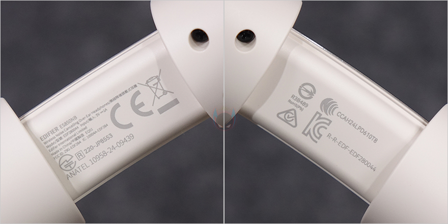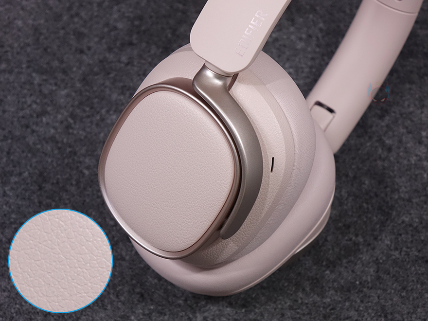 이어-컵(Ear-cup)과 연결되는 헤드밴드 끝부분에는 EDIFIER 로고를 새겨놨으며, 이어-컵 바깥쪽 표면에는 플라스틱 재질이지만 표면은 가죽 질감처럼 표현해 놨습니다. 그리고, 이어-컵 프레임 부분은 90˚ 회전과 착용 시 자동 각도조절이 되도록 틸트(Tilt) 기능을 적용해놨으며, 이어-컵 양쪽 디자인은 모두 동일하고, 프레임과 켭치는 이어-컵 윗부분에는 착용시 틸트 기능으로 열리면서 주변 소음을 감지할 수 있는 센서 덕트가 적용되어 있습니다.