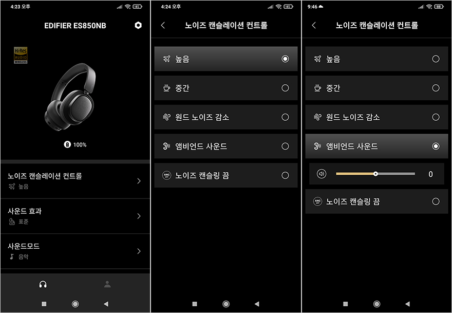 끝으로, ES850NB 무선 헤드폰을 통해 사운드 청음을 해보면, 전체적인 볼륨감은 조금 낮지만, 선명하고 깔끔한 편입니다. 딱 무선 헤드폰 취지에 맞는 그러니깐 외출이나 장소에 구애받지 않게 최대 볼륨으로 들어도 볼륨감이 튀지 않는 수준에서 귀에 피로감이 적은 선명하고 깔끔한 사운드를 즐길 수 있게 해 주죠. 음악 장르에 따라 사운드효과 모드를 적절히 사용하면 좀 더 나은 사운드를 즐길 수 있고, 좌우 스테레오 구분도 명확하게 구분해 줍니다. 이 밖에 노이즈 캔슬링 역시 앞서 확인한 높음/중간 구분과 주변 소음 감도 조절의 앰비언드 사운드 역시 단계별 차이를 느낄 수 있고, 헤드폰 착용감은 약간의 압박감은 있지만 편안한 편이라 무난합니다.