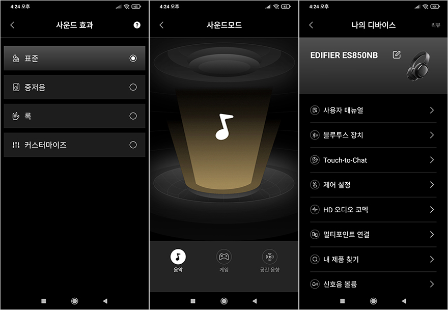 이 밖에도 에디파이어 공용 앱(App) ConneX도 지원하는데, 앱에서 ES850NB 무선 헤드폰이 인식되면 메인화면에서 배터리 잔량과 함께 노이즈 캔슬레이션 컨트롤/사운드효과/사운드모드의 3가지 메인 메뉴를 확인할 수 있고, 노이즈 캔슬레이션 컨트롤에는 높음/중간/윈드 노이즈 감소 3단계 조절과 주변 소음 감도를 조절할 수 있는 앰비언드 사운드, 노이즈 캔슬링 Off를 선택할 수 있습니다. 참고로, 노이즈 캔슬링 높음은 공항/지하철/버스 같은 시끄러운 곳에서, 중간은 사무실/카페/공원 같은 장소를 고려해 소음 감소를 적용했고, 최대 -45dB 감소시킵니다. 이 밖에 사운드효과에는 표준/중저음/록/커스터마이즈 4가지 모드를 지원하고, 사운드모드는 음악/게임/공간음향 3가지 모드를 지원하는데, 공간 음향 선택시에는 Hi-Res 오디오를 비활성화 시킵니다. 그리고, 디바이스 설정에서는 추가 메뉴들을 다룰 수 있는데, Touch-to-Chat 모드 On/Off 및 감도 조절, 블루투스 버튼의 노이즈 캔슬링 3단계 설정, 오디오 코덱 설정, 제품 찾기, 예약 종료 설정 등을 할 수 있습니다.