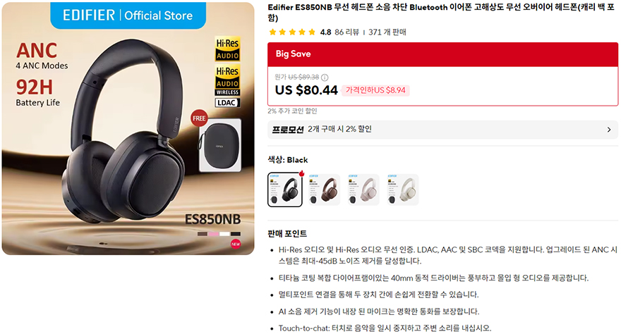 그동안 에디파이어(Edifier)의 블루투스 무선 헤드폰은 글로벌시장에서 모델명이 W로 시작하는 일명 W시리즈 제품들로 선보였습니다. 하지만, 이번에 선보인 ES850NB는 처음으로 W 시리즈가 아닌 모델입니다. 특히, 그동안 선보였던 W 시리즈 제품들은 무선 헤드폰에만 집중되는 그러니깐 최근 무선 헤드폰이 패션아이템으로까지 평가받는 시점에서 디자인에는 다소 소홀한 부분이 있었는데, 이 ES850NB는 4가지 컬러를 비롯해 디자인에도 상당히 신경을 썼습니다. 가죽 질감과 컬러별 프레임으로 패셔너블한 감성을 담고 있죠. 여기에 자사의 가성비다운 무선 헤드폰 특성도 그대로 살리고 있는 동시에 PC에서도 유선으로 사용할 수 있게 첫 소프트웨어까지 지원합니다. 물론, 초점은 무선 헤드폰에 좀 더 맞춘 형태이고, 휴대성과 함께 선명하고 깔끔한 그리고 귀에 피로감이 없는 적당한 볼륨감으로 만족스러운 사운드 품질을 들려줍니다. 정확히 패션아이템다운 무선 헤드폰 콘셉트를 보여주죠. 여기에 노이즈 캔슬링과 터치 탭 주변 대화 기능까지도 잘 갖추고 있습니다. 외출하면서 스마트폰으로 음악을 즐기기 위해 무선 헤드폰을 고려하고, 이왕이면 패션아이템으로까지 생각하고 있다면, 에디파이어의 ES850NB를 추천합니다.