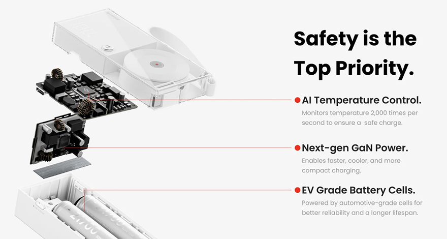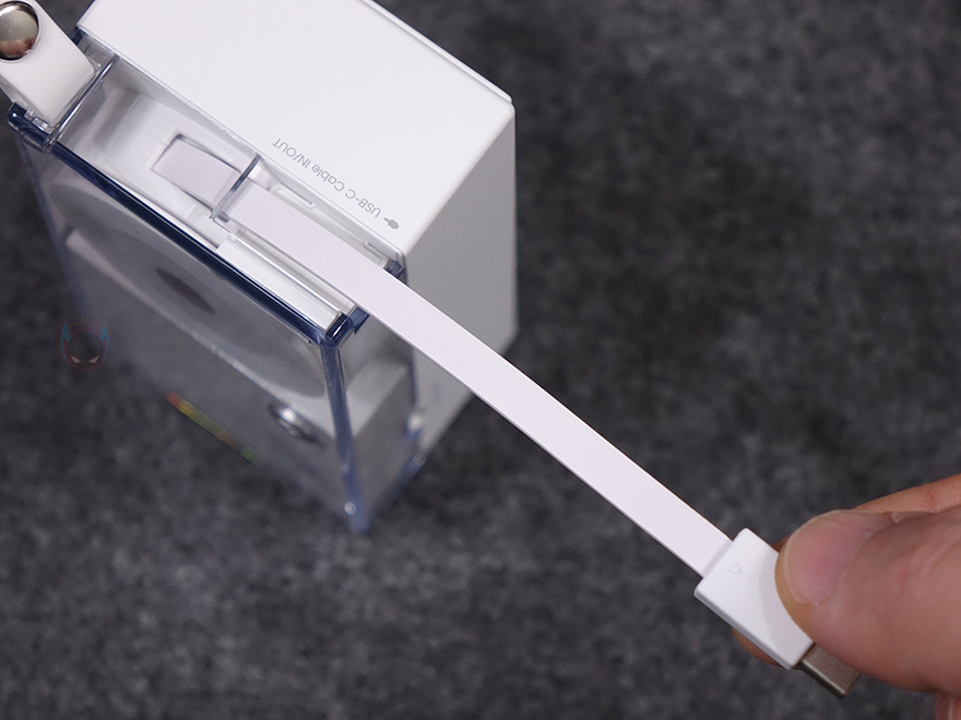 좀 더 자세히 살펴보면, 제품 상단은 앞서 제품의 주요 특징에서 확인했듯이 그리고, 모티브가 된 오디오 제품의 특징처럼 투명 디자인(Transparent design)을 적용하고 있습니다. 제조사가 제공하는 제품 소개를 참고해 보면, 전원 버튼이 배치된 상단 왼쪽에는 내부 온도조절, GaN 충전 등의 PCB기판이 들어있으며, LP판을 모티브 한 상단 오른쪽은 내장된 충전케이블로 줄자처럼 개폐식(Retractable)으로 적용했죠. 케이블을 당기면 늘어나고, 다시 당기면 늘어난 길이에서 멈추고, 다시 당기면 늘어나는 식으로 최근 보조배터리의 빌트-인 케이블을 좀 더 편리하게 적용했습니다. 참고로 케이블 길이는 최대 60cm이고, USB-C 인터페이스입니다. 그리고, 케이블을 당기거나 감길 때 원형 디자인 부분이 LP판처럼 돌죠. 감길 때는 자동이라 케이블 정리도 편리합니다.