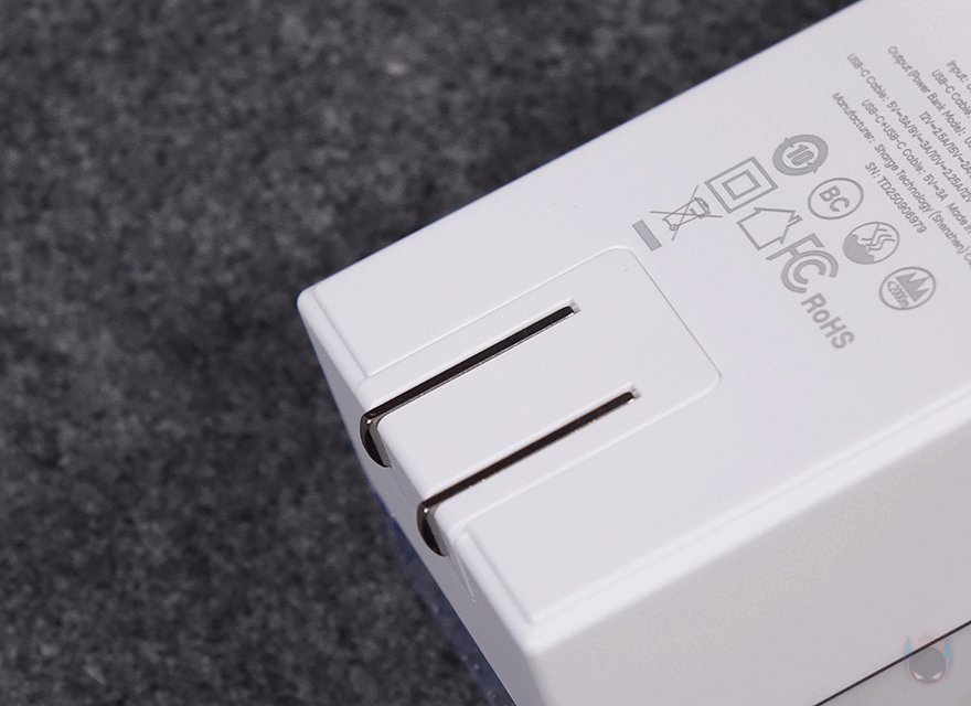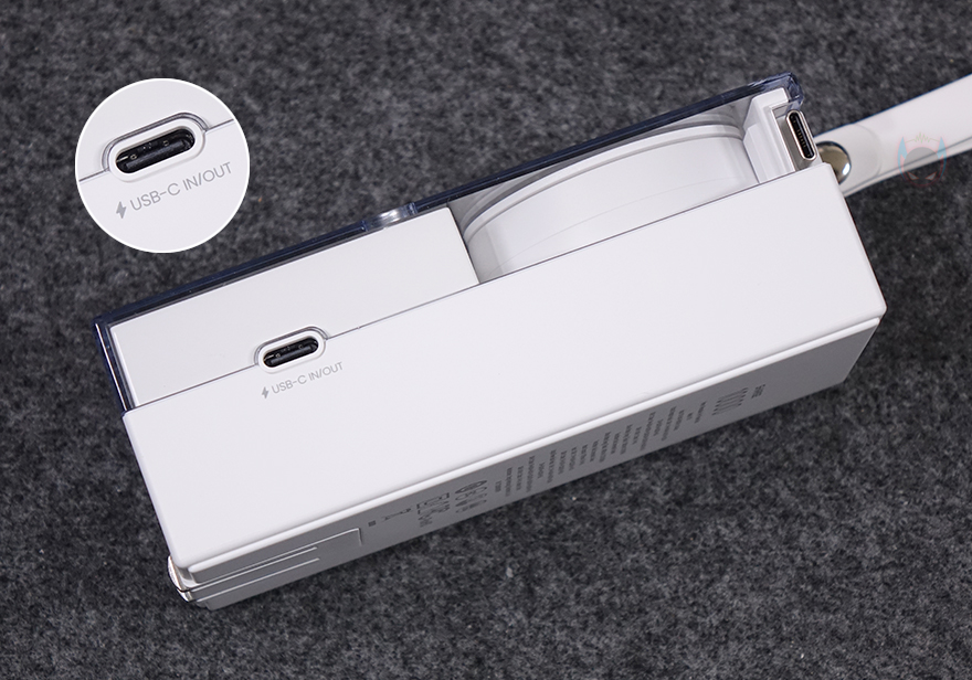 전원 버튼이 배치된 상단 왼쪽 측면에는 추가로 충전케이블을 연결할 수 있게 USB-C 포트를 갖추고 있는데, 입출력(Input/Output) 모두 지원합니다. 참고로, 방금 확인한 개폐식 충전 케이블 역시 입출력 모두 지원하고, 둘 다 단일 사용시 최대 30W 충전을 지원하고, 반대로 Retractable 3-in-1 보조배터리를 충전할때는 최대 20W로 충전되죠. 그리고, 측면에서 볼 때 상단 투명 부분과 나뉘는 하단 흰색 부분은 내부에 배터리 셀이 내장되어 있는데, 앞서 확인한 제조사 제공의 구조 이미지에서 확인했듯이 배터리 셀은 2개 들어있습니다. 그리고, 제품 후면에는 제품박스에서 확인했던 기본 사양 표기를 다시 확인할 수 있고, 아래에는 접이식 플러그(Foldable Pulg)를 적용하고 있으며, 기본 플러그가 110V의 US 플러그지만, 100~240V 프리볼트를 지원하기때문에 국내에서 사용할 때는 일명 돼지코라 부르는 EU/KR 플러그 어댑터를 사용하면 됩니다. 물론, 플러그를 사용하는 경우에는 Retractable 3-in-1 보조배터리가 충전기 역할로 바뀌는거라 굳이 충전기처럼 사용할 필요가 없다면 빌트-인 케이블과 측면 충전 포트로 만 사용하는 보조배터리 역할로도 충분합니다.