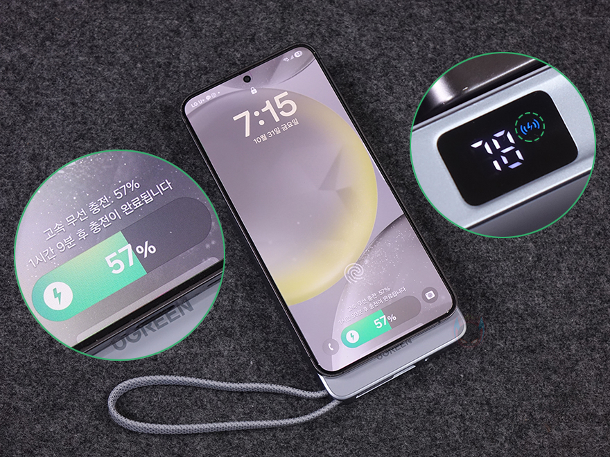 직접 유그린 MagFlow 무선 보조배터리를 사용해 보면, 먼저 유선 충전은 기본 내장된 케이블로 바로 사용할 수 있어서 편리하고, 전원을 켜거나 바로 충전을 연결하면 측면 디스플레이가 켜지고, 배터리 잔량과 함께 고속 충전 시 블루색상의 번개표시를 해줍니다. 그리고, 무선 충전을 할 때는 무선 신호 표기를 해줘서 유/무선 충전을 쉽게 구분되도록 하고 있죠. 또한, 무선 충전 같은 경우에는 방향과 상관없이 충전할 수 있고, Qi2 인증이 아닌 저전력의 무선 이어폰이나 스마트워치, 또는 기타 Qi 무선 기기도 충전 코일 위치만 맞추면 모두 호환이 됩니다.