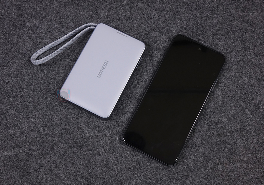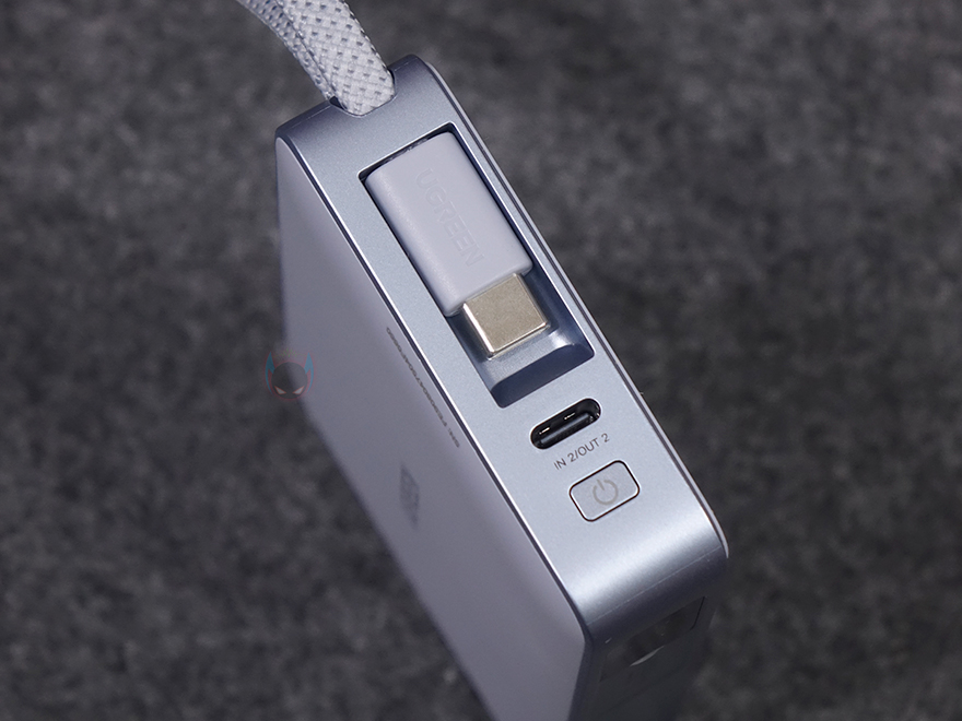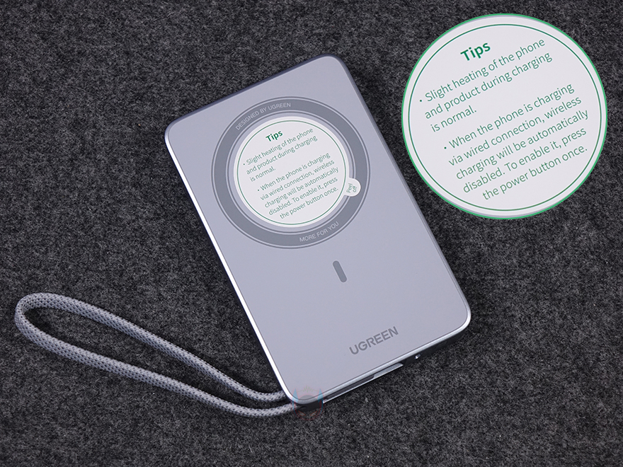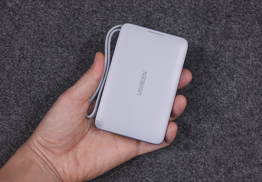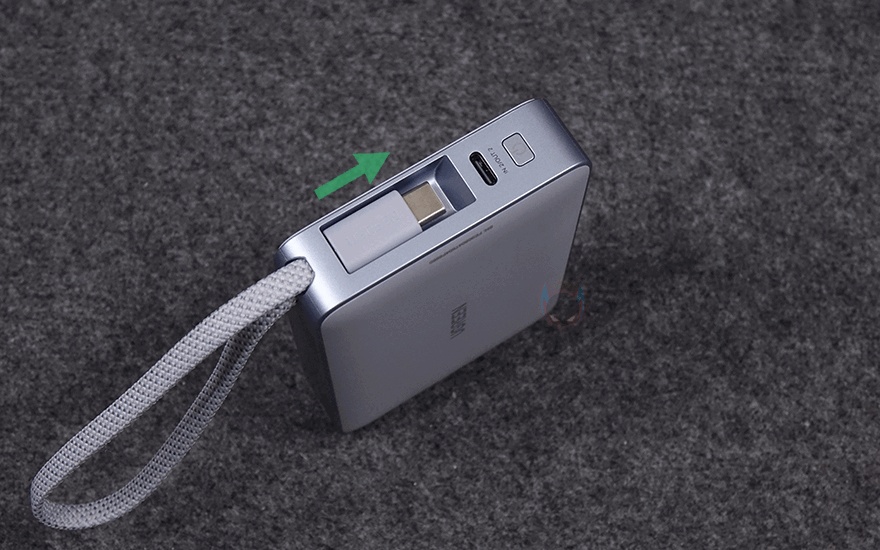 유그린의 MagFlow 무선 보조배터리 디자인 및 외형을 살펴보면, 색상은 옅은 블루색상과 그레이 색상 조합이며, 크기는 110.8x70x21mm로 요즘 스마트폰 크기보다 작은 편이라 한 손에 잡기에 편한 휴대성을 가지고 있습니다. 물론, 무게도 약 257g으로 부담되지 않죠. 그리고, 모서리 한쪽 부분에는 스트랩처럼 보이는 케이블이 있는데, 바로 충전 케이블로 1만 회 굽힘 테스트를 거친 군용 등급 케이블입니다. 케이블을 사용하지 않을 때는 스트랩처럼 사용할 수 있고, 충전할 때는 케이블을 반대쪽으로 빼내면 됩니다. 참고로, 케이블은 최대 약 20cm 길이정도 빼낼 수 있습니다. 케이블의 연결 인터페이스는 USB-C이며, 스트랩 사용 시 빠지지 않고, 수납되는 형태로 들어가죠. 그리고, 바로 옆에는 추가로 케이블을 연결할 수 있는 USB-C 포트가 배치되어 있고, 포트 옆에는 전원 버튼이 배치되어 있습니다. 참고로, 내장된 케이블과 USB-C 포트 모두 입출력 최대 30W를 지원합니다.