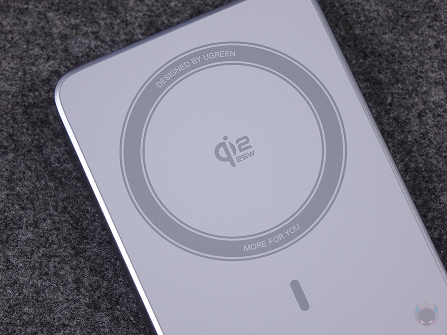 보조배터리 한쪽 측면에는 제품 박스에서 확인했던 제품의 기본 사양 표기를 다시 확인할 수 있으며, 반대쪽 측면에는 용량 표기와 함께 배터리 충전 및 상태를 확인할 수 있는 디스플레이가 적용되어 있습니다. 그리고, 보조배터리 후면에는 무선 충전을 지원하는데, 마그네틱 방식으로 Qi2 인증까지 받아 최대 25W 충전을 지원하죠. 개봉 시에는 안내문구 스티커가 부착되어 있기 때문에 사용 전에 떼내야 합니다. 물론, Qi2 이전 세대인 Qi 1세대 무선 충전도 지원하고, 마찰 최소화를 위해 표면 재질도 고품질 실리콘으로 처리해 놨죠. 끝으로, 기본 제공되는 USB 충전케이블은 양쪽 모두 USB-C 인터페이스를 가졌고, 길이는 약 50cm입니다.