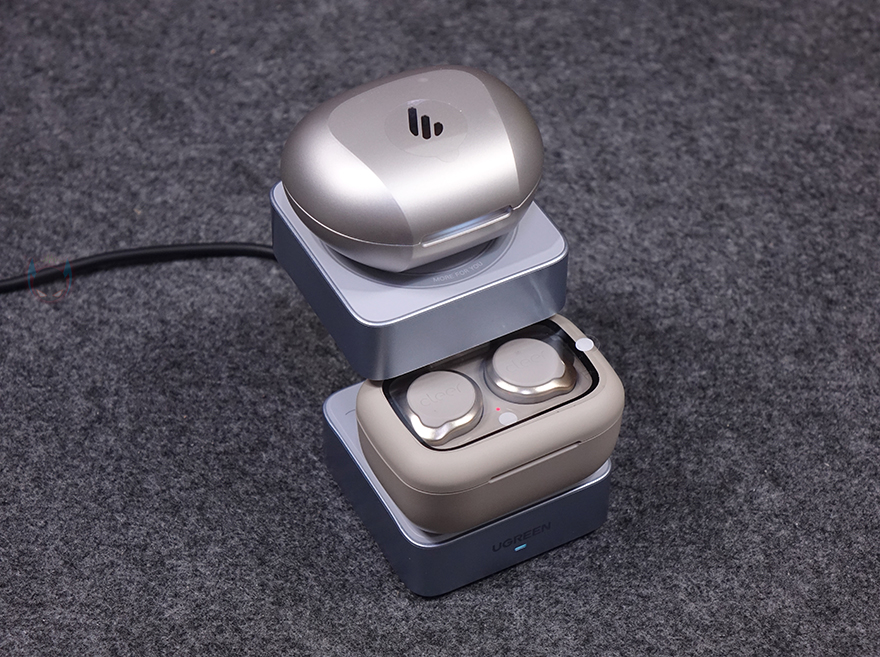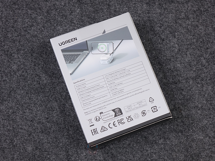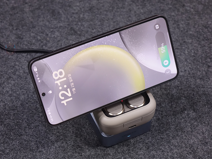 직접, 유그린 MagFlow 2-in-1 마그네틱 무선 충전기를 사용해보면, 상판 무선 충전이 기본적으로 마그네틱 방식이라 충전 콘셉트 기준은 애플 아이폰에 맞춰서 있습니다. 하지만, 이미 앞전에 출시한 모델과 마찬가지로 이번 모델도 무선 충전을 지원하는 기기는 모두 호환이 되고, 마그네틱 링이나 마그네틱 케이스를 사용한 스마트폰이면 동일하게 부착해서 사용할 수 있습니다. 실제 삼성 갤럭시 스마트폰도 마그네틱 링을 부착해 무선 충전이 되는 걸 확인할 수 있었고, 무선 충전 시 앞부분 로고 아래 LED가 점등되는 것도 확인할 수 있었죠. 또한, 수직, 수평 어느 방향이든 자유롭게 충전도 됩니다. 또한, 하판은 무선 이어폰 용도로 사용되는데, 역시 꼭 애플 무선 이어폰 제품이 아니라도 무선 충전을 지원하는 무선 이어폰은 모두 호환이 됩니다. 스마트폰과 동시에 충전할 때는 자리 침범이 생길 수 있기 때문에 스마트폰은 수평으로 올려두는 게 낫습니다. 그리고, 측면 USB-C 포트를 통해서도 유선 충전을 추가할 수 있어서 최대 3대를 동시에 충전도 가능하죠.