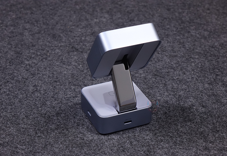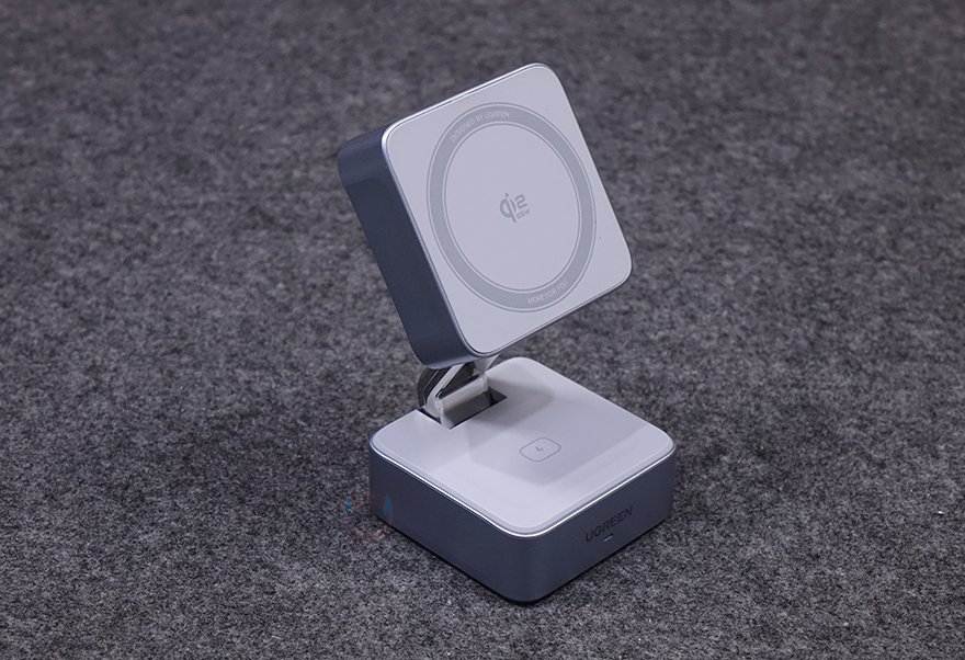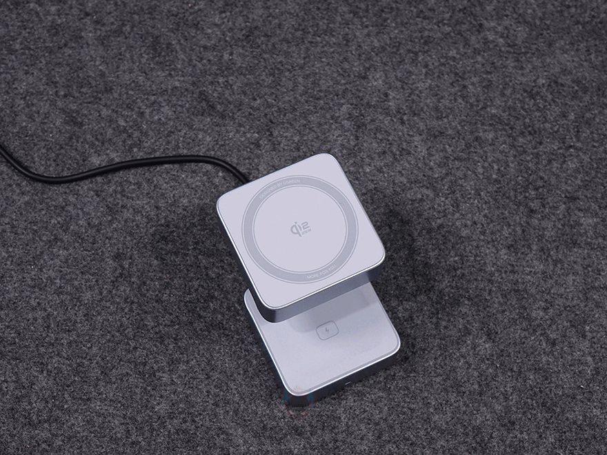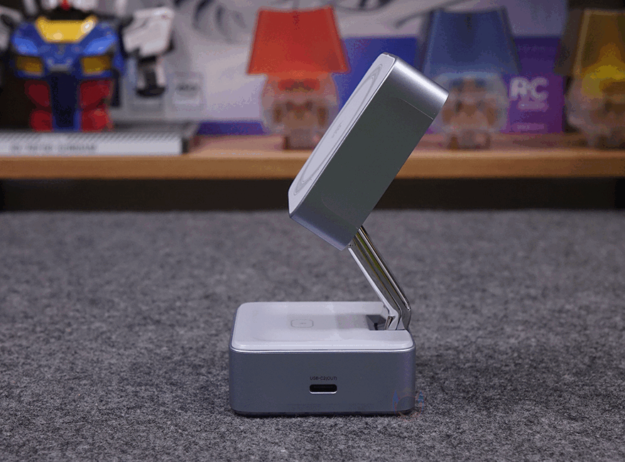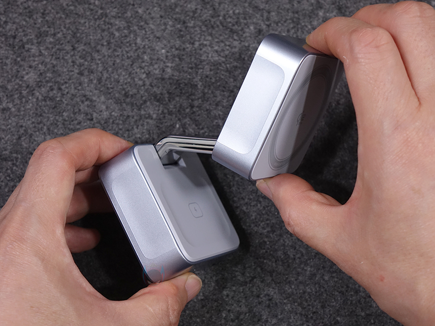 끝으로, 접이식의 힌지부분은 튼튼하기 때문에 상판을 어느 각도에 맞춰놔도 잘 지탱해 줍니다. 그래서, 꼭 마그네틱 방식으로 충전할 필요는 없죠. 실제로 마그네틱을 갖추지 않은 무선 충전의 다른 기기들을 상판 수평으로 해놓고 사용해도 잘 작동되는 걸 확인할 수 있었습니다. 물론, 상판이 Qi2 무선 충전이지만, Qi2 이전 세대 Qi도 호환되고, Qi 무선 기기를 올려놓을 때는 알아서 충전 속도를 낮추는 등 총 8가지 보호회로가 적용되었기 때문에 안심해도 됩니다. 또한, 상판 각도조절만 잘하면, 하판도 역시 동시에 사용이 가능하기 때문에 사용자가 꼭 스마트폰 목적이 아니라도 다양한 용도로 사용할 수 있죠.