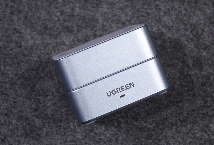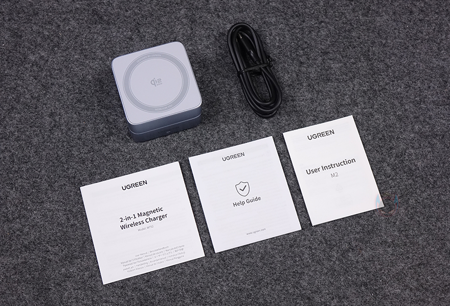 유그린의 MagFlow 2-in-1 마그네틱 무선 충전기를 살펴보면, 디자인은 곡선형 사각형으로 올해 초 먼저 출시했던 2-in-1 무선 충전기보다 좀 더 각진 모습을 가졌습니다. 물론, 두 제품 모두 접이식이랑 앞서 언급했듯이 구조는 동일하죠. 접힌 상태의 크기는 약 60x60x42mm로 한 손에 들어올 정도로 작아서 주머니에 넣고 다닐 수 있는 휴대성이며, 무게도 약 230으로 부담되지 않죠. 좀 더 자세히 살펴보면, 전면에는 UGREEN 로고와 함께 바로 아래 충전상태를 확인할 수 있는 LED 인디케이터가 배치되어 있고, 전면 기준 오른쪽 측면에는 유선으로 추가 충전할 수 있게 USB-C 포트가 배치되어 있습니다. 그리고, 로고와 같은 위치의 반대편 후면에는 보조배터리나 충전기에 연결해 전력을 공급받는 입력포트로 역시 USB-C 포트가 배치되어 있죠. 올해 초 출시했던 2-in-1 무선 충전기와 동일한 구조입니다.