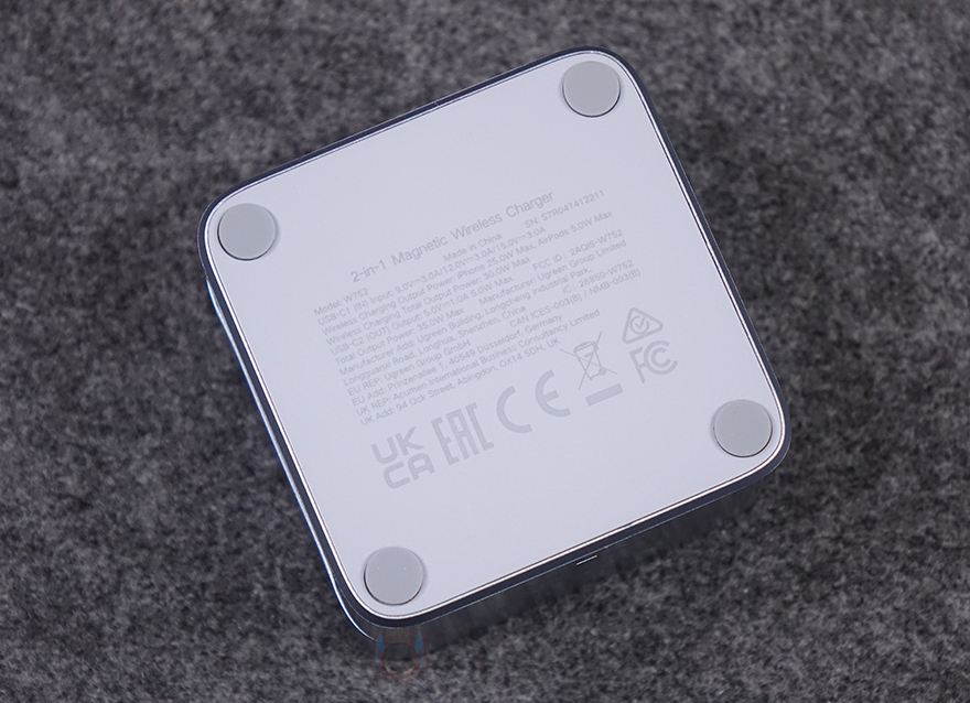 그리고, 접이식이라 충전은 상판과 하단 2 구간으로 나뉘어지는데, 먼저 상단 위치의 상판은 무선 충전 지원으로 Qi2 로고와 함께 마그네틱 지원을 뜻하는 링 디자인도 함께 그려놨습니다. 접이식에서 사용하기 위해 펼칠 때는 하판을 잡고 상판을 들어 올리면 되고, 힌지 부분이 튼튼하기 때문에 어느 각도에서든 잘 고정됩니다. 참고로, 상판 각도 범위는 0~70˚입니다. 그리고, 상판을 들어 올리면 하판 부분도 무선 충전으로 사용할 수 있게 됩니다. 앞서 잠깐 언급했던 올해 초 먼저 출시한 자사의 2-in-1 마그네틱 무선 충전기는 Qi2 인증지만, 상판이 최대 15W로 Qi2 규격 최대인 25W까지 지원은 아니었습니다. 하지만, 이번에 출시한 MagFlow 2-in-1 마그네틱 무선 충전기는 상판이 규격상 최대인 25W를 지원하고, 그리고, 나머지 하판과 측면 유선 충전이 각각 5W로 총 35W를 지원합니다. 끝으로, 충전기 밑바닥부분에는 모서리 부근에 미끄럼방지 패드를 부착해 놨고, 중앙에 다시 한번 제품의 기본 사양 표기를 확인할 수 있으며, 기본 제공되는 USB 충전케이블은 1m 길이에 양쪽 모두 USB-C to C 인터페이스를 가졌죠.