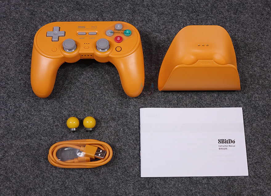 본격적으로 8BitDo Pro 3 블루투스 게임패드를 살펴보면, 일단 색상은 처음 출시 당시 그레이(Gray), G-클래식(G-Classic), 퍼플(Purple) 3가지로 출시되었고, 최근에 새롭게 오렌지(Orange) 색상이 추가되었습니다. G-클래식이나 그레이색상처럼 오렌지 색상도 약간 레트로 감성을 줍니다. 그리고, 앞서 언급했듯이 Pro 3에 드디어 Ultimate 시리즈처럼 충전독이 추가되었는데, Pro 3와 Ultimate 두 제품은 잠깐 비교해 보면, 충전 거치대 모양이 비슷합니다. 하지만, 서로 게임패드 모양에 따라 충전독 디자인을 가졌기 때문에 서로 호환되지는 않습니다.