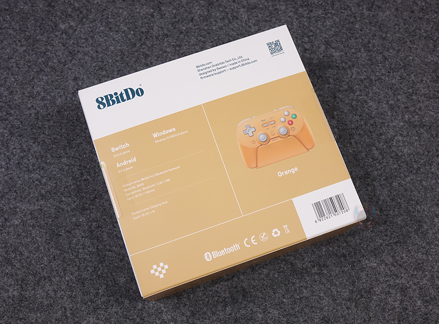 제품 패키지는 기본 Pro 시리즈 제품들과 마찬가지로 박스형태이고, 박스디자인도 유사합니다. 전면에는 제품명과 함께 제품 이미지를 담고 있는데, Pro 시리즈는 Pro +부터 블루투스 지원을 했죠. 그래서, Pro 3 역시 블루투스 지원은 기본이고, 닌텐도 스위치/윈도우/안드로이드 플랫폼 지원도 그대로 유지하고 있습니다. 그리고, 제품 이미지에서 이미 Pro 시리즈 게임패드를 사용해 보거나 알고 있는 소비자라면 이미지만 봐도 무엇이 새롭게 추가되었는지 짐작할 수 있는데, 뒤에서 확인하겠지만, 이번 Pro 3 블루투스 게임패드의 가장 큰 변화는 충전독(Charging Dock)이 추가되었습니다. 그래서, 시작에서 잠깐 언급했듯이 Ultimate 시리즈 부럽지 않게 나왔다고 언급한 거죠. 참고로, 전면 제품 이미지는 제품의 색상별로 담겨 있습니다. 그리고, 박스 후면에는 방금 언급했던 플랫폼 지원과 제품의 기본 사양 표기를 확인할 수 있고, QR코드의 매뉴얼 안내 표시도 확인할 수 있죠.