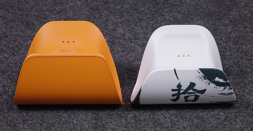 이번 Pro 3 블루투스 게임패드에 새롭게 추가된 충전독(Charging dock)은 앞서 잠깐 확인한 Ultimate 시리즈의 충전독과 유사한 디자인을 가졌지만, 서로 호환은 되지 않습니다. 그리고, 크기도 좀 더 Pro 3가 크죠. 이 외에는 게임패드와 충전 연결되는 방식은 포고핀으로 동일하고, 전면 맨 아랫부분에 충전상태를 확인할 수 있는 LED 램프-바, 밑바닥부분에 패드 부착과 무선 2.4G 수신기가 수납되는 공간도 동일합니다. 수신기는 USB-C 인터페이스 연결방식이고, 디자인은 기존과 동일한 벽돌모양입니다.