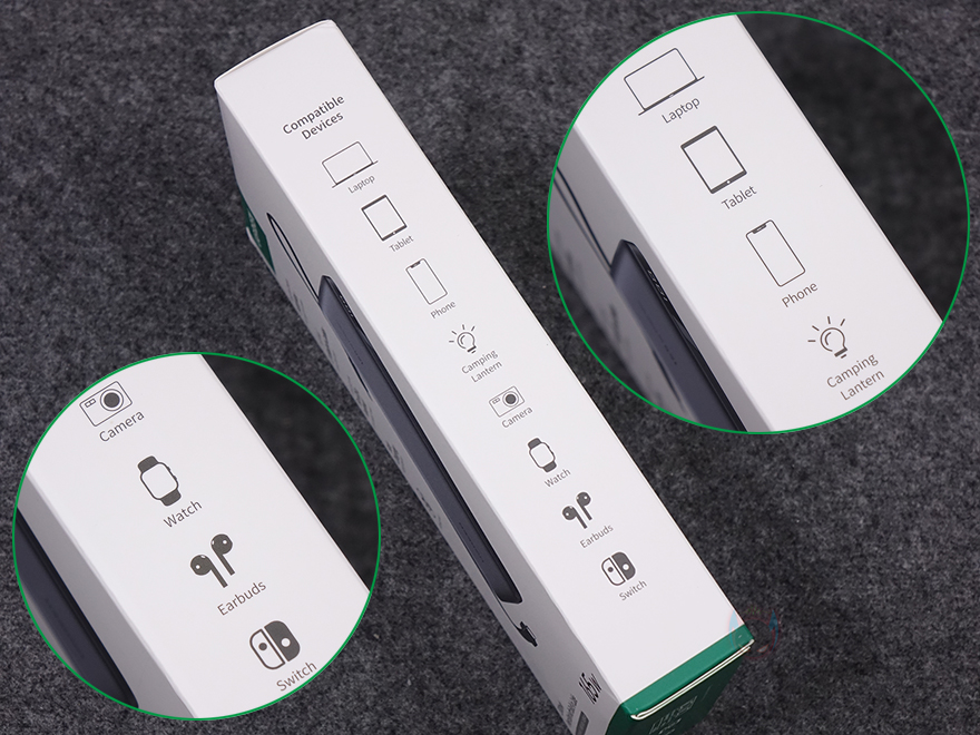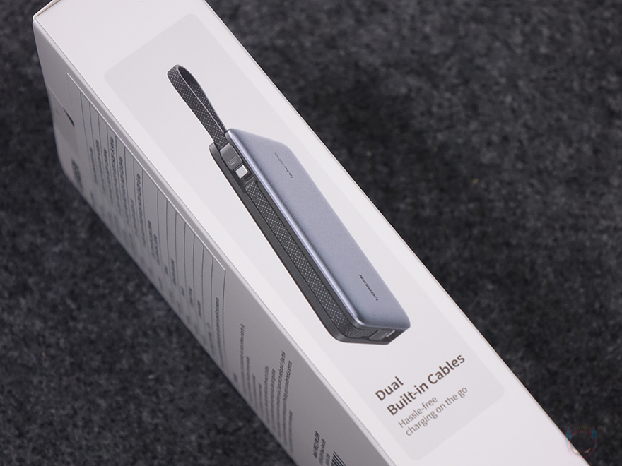 제품 패키지는 박스 형태로 기존 자사의 보조배터리 제품들과 마찬가지로 전면에는 제품 이미지를 담고 있어서 개봉 전에 미리 제품 디자인을 확인할 수 있습니다. 그래서, 제품 이미지만 봐도 보조배터리에 케이블이 달려있는 제품이라는걸 알 수 있죠. 또한, 이미지 옆에도 주요 특징으로 2개의 케이블 내장 언급과 함께 PD 3.1 버전으로 단일 포트 최대 140W 충전 지원, 모바일 멀티 플랫폼 고속충전 지원, 보호회로, 항공 탑승 시 기내 반입 인증을 언급하고 있으며, 아래에 배터리 용량과 함께 입출력 포트 및 케이블 표시도 확인할 수 있습니다. 박스 한쪽 측면에는 케이블이 내장되었을 때 측면 이미지를 추가로 담고 있으며, 반대쪽 측면에는 다양한 전자기기 충전 지원 표기를 해놨고, 박스 후면에는 제품의 기본 사양을 표기해 놨습니다.
