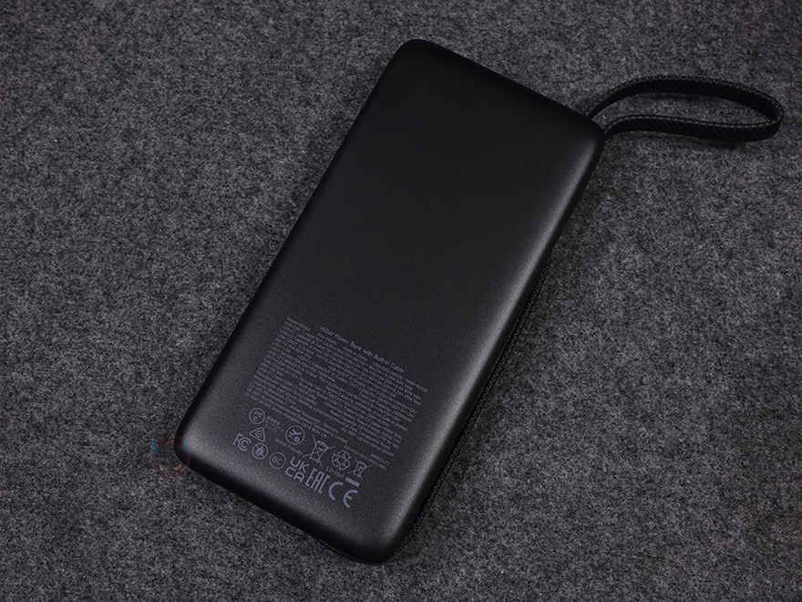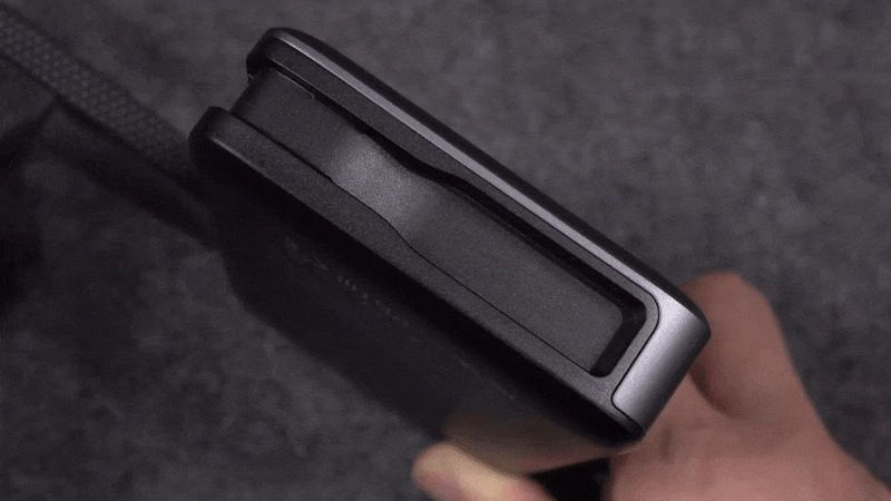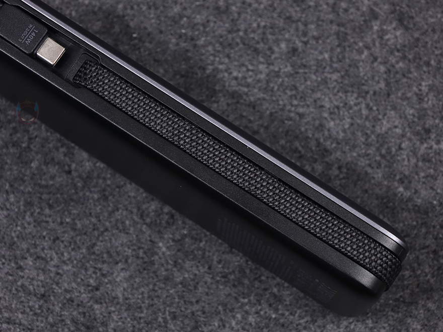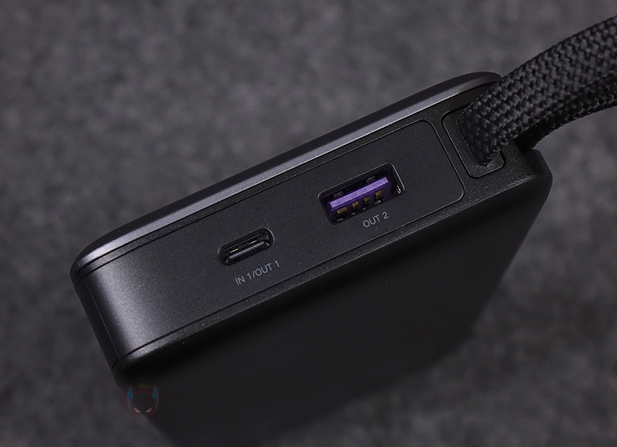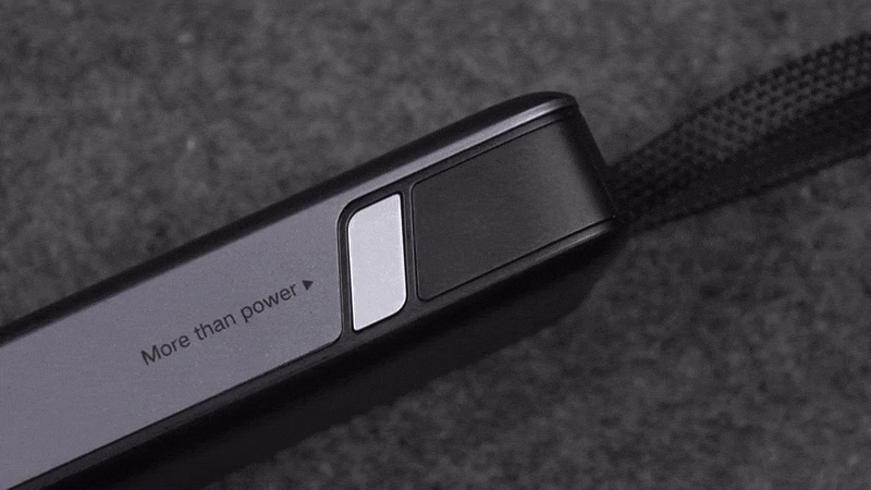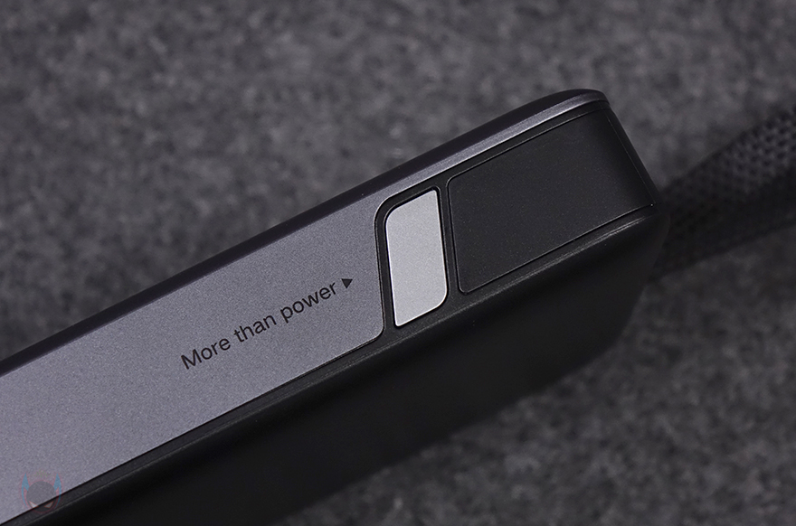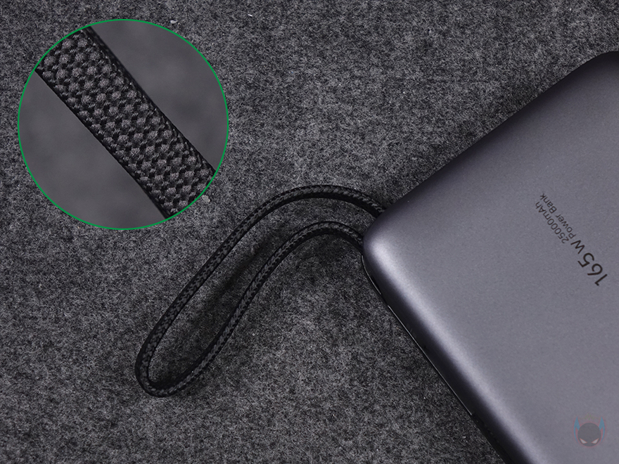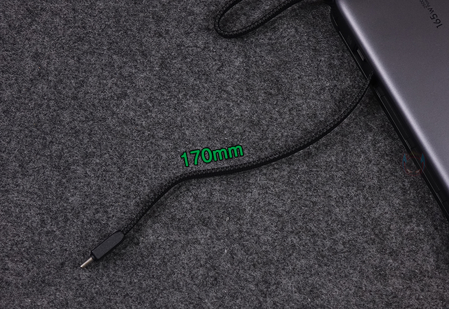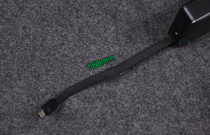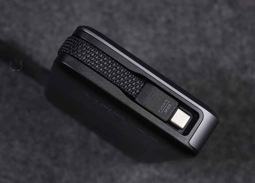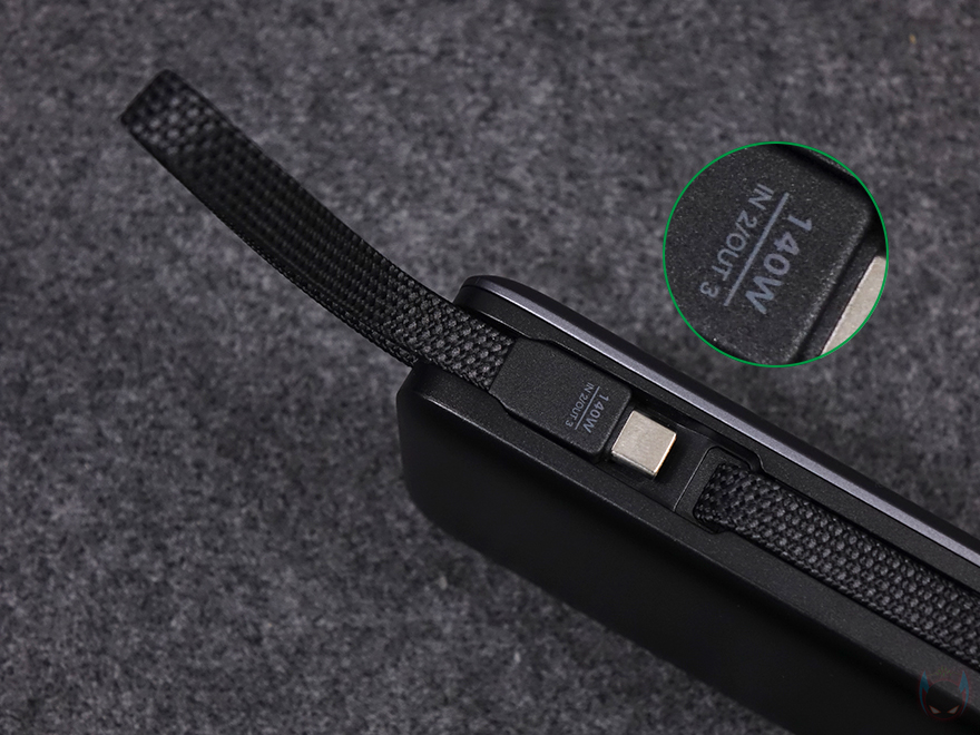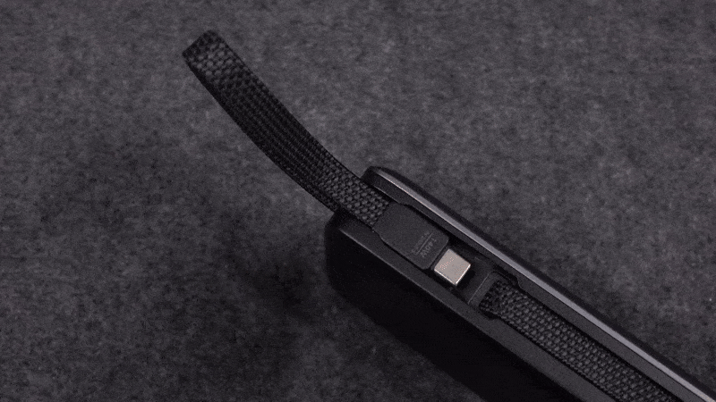 좀 더 자세히 살펴보면, 모서리 한쪽 부근에는 스트랩 같은 줄이 있는데, 플랫 하면서 슬리빙처리까지 깔끔하게 적용되어 있습니다. 사실 이 제품은 바로 이 제품의 첫 번째 내장 충전 케이블로 측면에 140W 표기와 함께 USB-C 인터페이스를 확인할 수 있고, 홀더 부분에 걸려있는 걸 확인할 수 있죠. 케이블을 잡고 가볍게 앞으로 밀면 쉽게 빠지면서 충전할 때 케이블로 사용되고, 길이는 약 18cm를 가졌죠. 그리고, 이와 같은 위치 측면 옆으로 또 하나의 케이블이 길게 수납된 걸 확인할 수 있는데, 그대로 케이블을 따라가다보면 보조배터리 아랫부분 한 홈에 USB-C 인터페이스가 수납된걸 확인할 수 있습니다. 이 케이블은 바로 2번째 내장 충전 케이블로 65W 충전을 지원하고, 길이는 약 17cm를 가졌죠. 그리고, 65W 케이블 같은 경우에는 140W 케이블처럼 스트랩으로 사용되는 건 아니라서 좀 더 수납이 편하도록 마그네틱 방식을 적용했죠.
